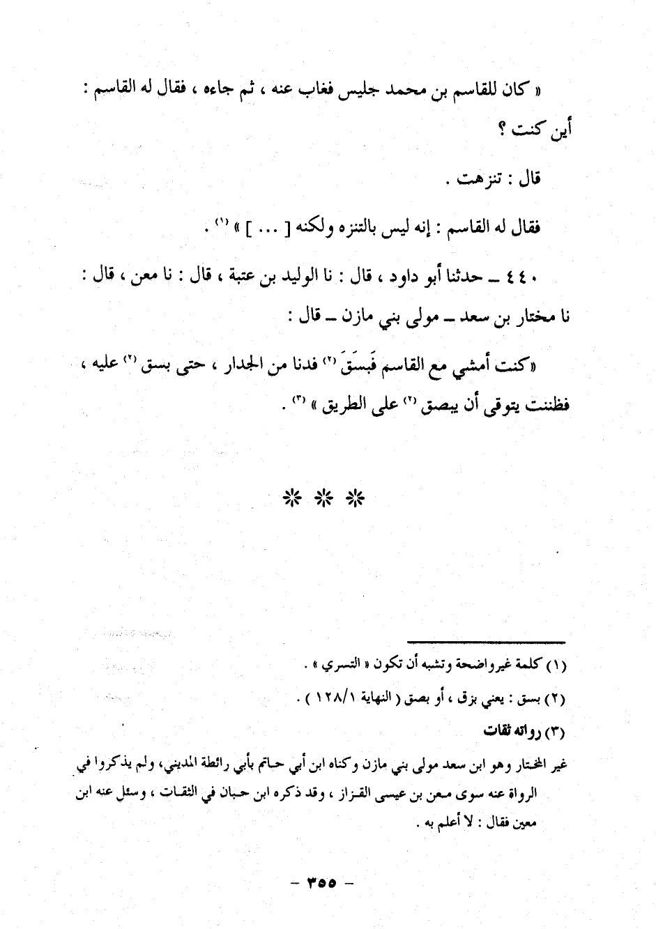 425 - حَدَّثَنَا أَبُو دَاوُدَ قَالَ: نا الْوَلِيدُ بْنُ عُتْبَةَ، قَالَ: نا مَعْنٌ، قَالَ: نا مُخْتَارُ بْنُ سَعْدٍ مَوْلَى بَنِي مَازِنٍ قَالَ: §كُنْتُ أَمْشِي مَعَ الْقَاسِمِ فَبَسَقَ فَدَنَا مِنَ الْجِدَارِ، حَتَّى بَسَقَ عَلَيْهِ، فَظَنَنْتُ يَتَوَقَّى أَنْ يَبْصُقَ عَلَى الطَّرِيقِ.