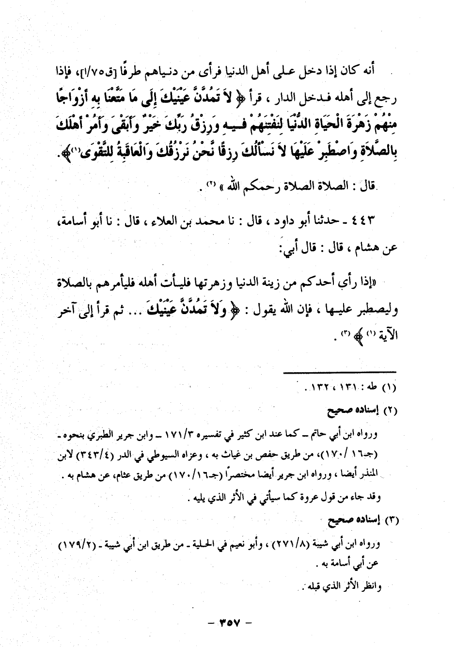 428 - حَدَّثَنَا أَبُو دَاوُدَ قَالَ: نا مُحَمَّدُ بْنُ الْعَلَاءِ، قَالَ: نا أَبُو أُسَامَةَ، عَنْ هِشَامٍ، قَالَ: قَالَ أَبِي: §إِذَا رَأَى أَحَدُكُمْ مِنْ زِينَةِ الدُّنْيَا وَزَهْرَتِهَا فَلْيَأْتِ أَهْلَهُ فَلْيَأْمُرْهُمْ بِالصَّلَاةِ وَلْيَصْطَبِرْ عَلَيْهَا، فَإِنَّ اللَّهَ يَقُولُ: {وَلَا تَمُدَّنَّ عَيْنَيْكَ. .} [طه: 131] ثُمَّ قَرَأَ إِلَى آخِرِ الْآيَةِ.