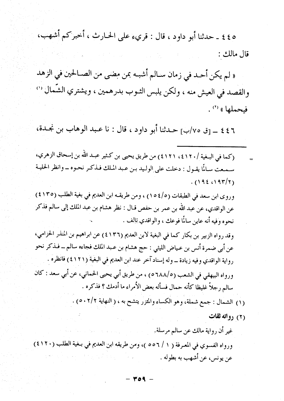 430 - حَدَّثَنَا أَبُو دَاوُدَ قَالَ: قُرِئَ عَلَى الْحَارِثِ وَأَنَا شَاهِدٌ، أَخْبَرَكُمْ أَشْهَبُ، قَالَ مَالِكٌ: §لَمْ يَكُنْ أَحَدٌ فِي زَمَانِ سَالِمٍ أَشْبَهَ بِمَنْ مَضَى مِنَ الصَّالِحِينَ فِي الزُّهْدِ وَالْقَصْدِ فِي الْعَيْشِ مِنْهُ، وَلَكِنْ يَلْبَسُ الثَّوْبَ بِدِرْهَمَيْنِ، وَيُشْتَرَى الشِّمَالَ فَيَحْمِلُهَا.