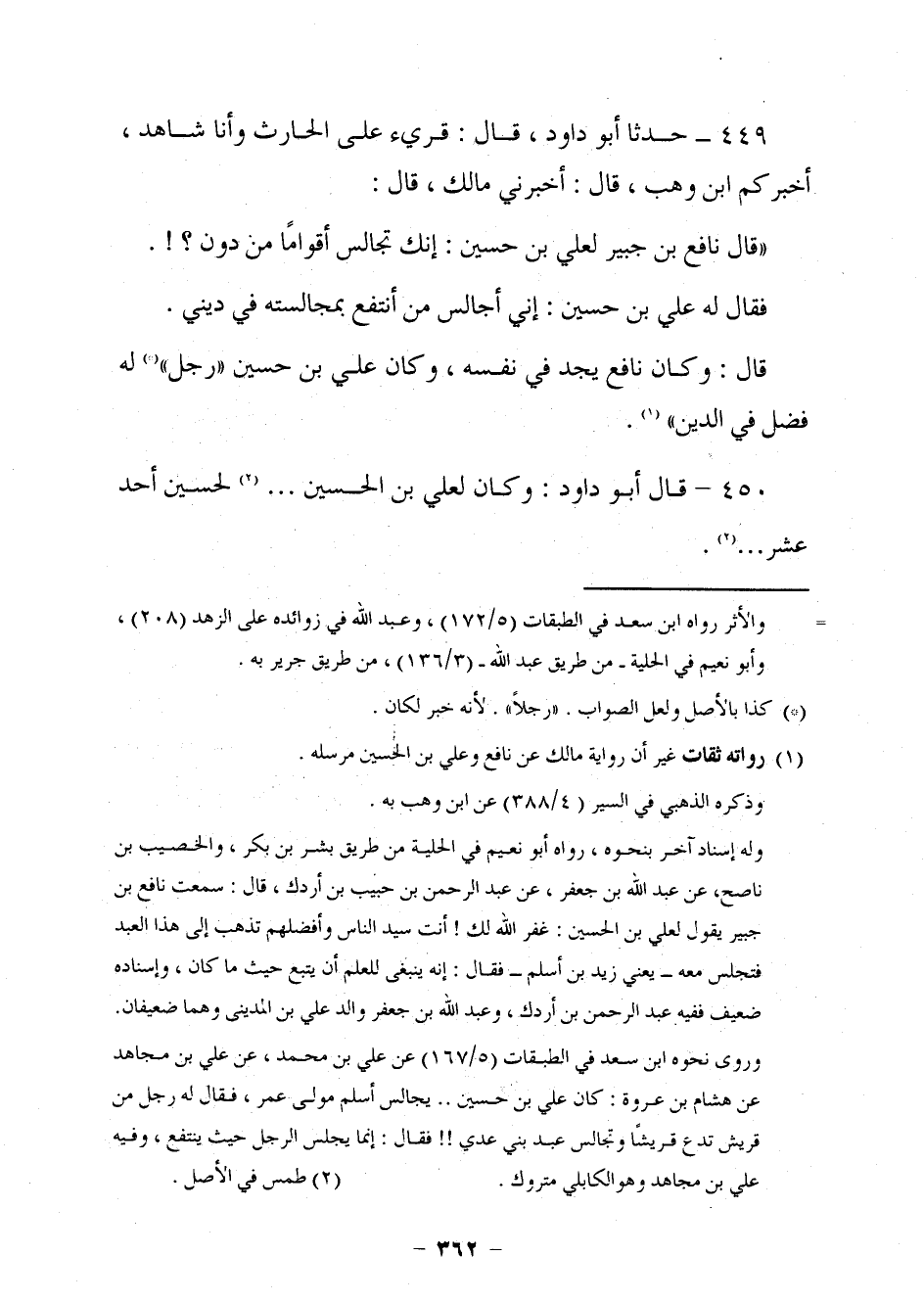 434 - حَدَّثَنَا أَبُو دَاوُدَ قَالَ: قُرِيءَ عَلَى الْحَارِثِ وَأَنَا شَاهِدٌ، أَخْبَرَكُمُ ابْنُ وَهْبٍ، قَالَ: أَخْبَرَنِي مَالِكٌ، قَالَ: §قَالَ نَافِعُ بْنُ جُبَيْرٍ لِعَلِيِّ بْنِ حُسَيْنٍ: إِنَّكَ تُجَالِسُ أَقْوَامًا مِنْ دُونٍ؟ فَقَالَ لَهُ عَلِيُّ بْنُ حُسَيْنٍ: إِنِّي أُجَالِسُ مَنْ أَنْتَفِعِ بِمُجَالَسَتِهِ فِي دِينِي. قَالَ: وَكَانَ نَافِعٌ يَجِدُ فِي نَفْسِهِ، وَكَانَ عَلِيُّ بْنُ حُسَيْنٍ رَجُلٌ لَهُ فَضْلٌ فِي الدِّينِ. قَالَ أَبُو دَاوُدَ: وَكَانَ لِعَلِيِّ بْنِ الْحُسَيْنِ. . لِحُسَيْنٍ أَحَدَ عَشَرَ. . .