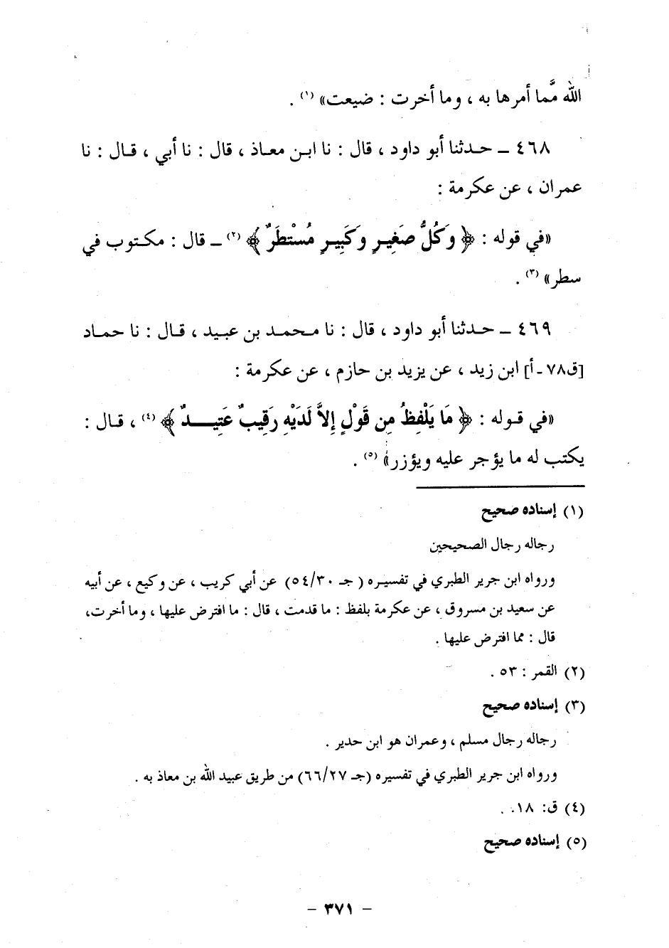 451 - حَدَّثَنَا أَبُو دَاوُدَ قَالَ: نا ابْنُ مُعَاذٍ، قَالَ: نا أَبِي قَالَ: نا عِمْرَانُ، عَنْ عِكْرِمَةَ، فِي قَوْلِهِ: {§وَكُلُّ صَغِيرٍ وَكَبِيرٍ مُسْتَطَرٌ} [القمر: 53] قَالَ: مَكْتُوبٌ فِي سَطْرٍ.