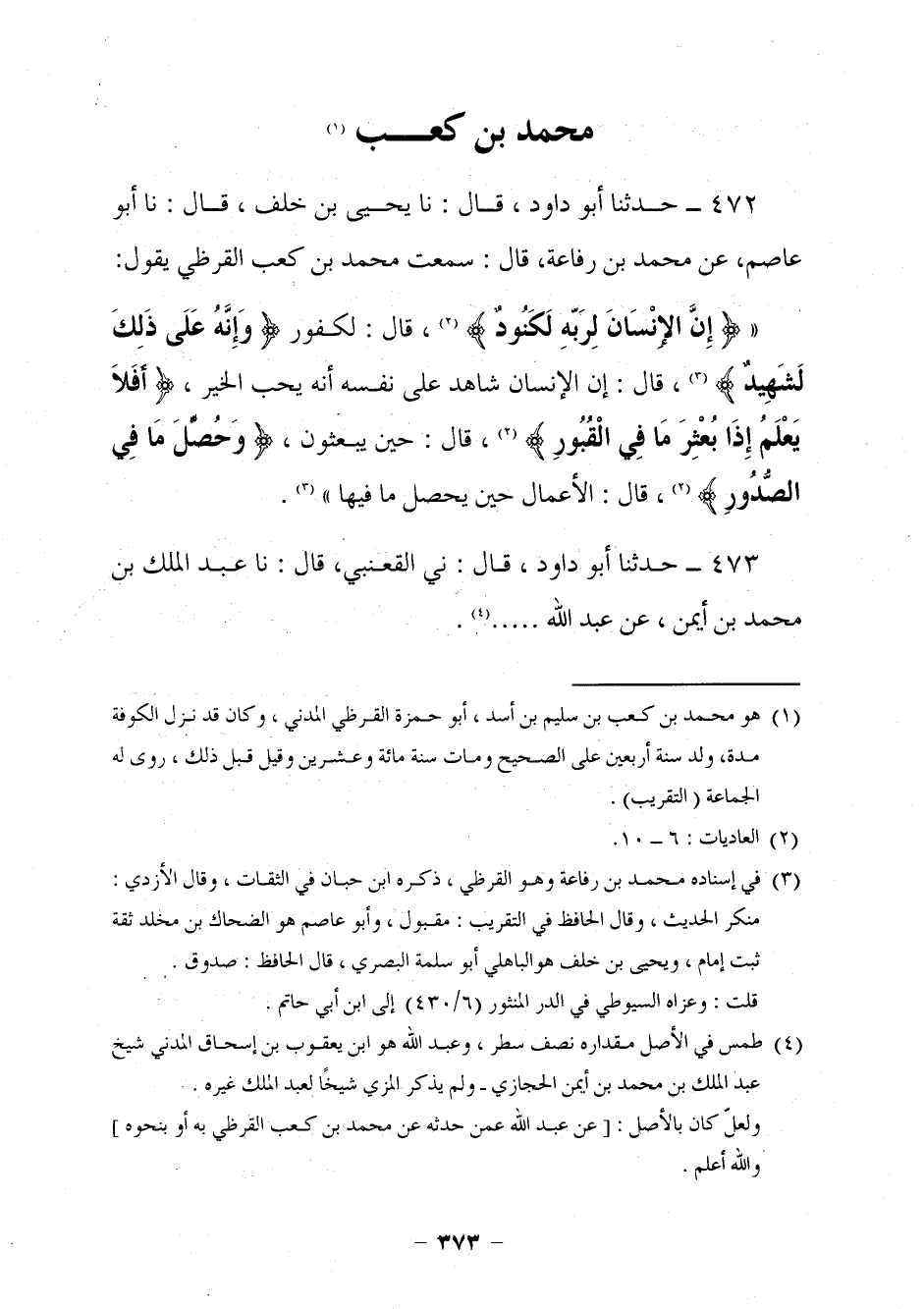 455 - حَدَّثَنَا أَبُو دَاوُدَ قَالَ: نا يَحْيَى بْنُ خَلَفٍ، قَالَ: نا أَبُو عَاصِمٍ، عَنْ مُحَمَّدِ بْنِ رِفَاعَةَ، قَالَ: سَمِعْتُ مُحَمَّدَ بْنَ كَعْبٍ الْقُرَظِيَّ، يَقُولُ: {§إِنَّ الْإِنْسَانَ لِرَبِّهِ لَكَنُودٌ} [العاديات: 6] قَالَ: «لَكَفُورٌ» {وَإِنَّهُ عَلَى ذَلِكَ لِشَهِيدٌ} [العاديات: 7] ، قَالَ: «إِنَّ الْإِنْسَانَ شَاهِدٌ عَلَى نَفْسِهِ أَنَّهُ يُحِبُّ الْخَيْرَ» {أَفَلَا يَعْلَمُ إِذَا بُعْثِرَ مَا فِي الْقُبُورِ} [العاديات: 9] ، قَالَ: «حِينَ يُبْعَثُونَ» {وَحُصِّلَ مَا فِي الصُّدُورِ} [العاديات: 10] ، قَالَ: «الْأَعْمَالُ حِينَ يُحَصَّلُ مَا فِيهَا» . حَدَّثَنَا أَبُو دَاوُدَ قَالَ: ني الْقَعْنَبِيُّ، قَالَ: نا عَبْدُ الْمَلِكِ بْنُ مُحَمَّدِ بْنِ أَيْمَنَ، عَنْ عَبْدِ اللَّهِ. . . . . -[374]- حَدَّثَنَا أَبُو دَاوُدَ قَالَ: نا هِشَامُ بْنُ خَالِدِ أَبُو مَرْوَانَ، قَالَ: نا مُحَمَّدُ بْنُ جُبَيْرٍ، قَالَ: نا مُحَمَّدُ بْنُ زِيَادٍ، عَنْ يَزِيدَ بْنِ شُرَيْحٍ، عَنْ كَعْبٍ، نَحْوَهُ