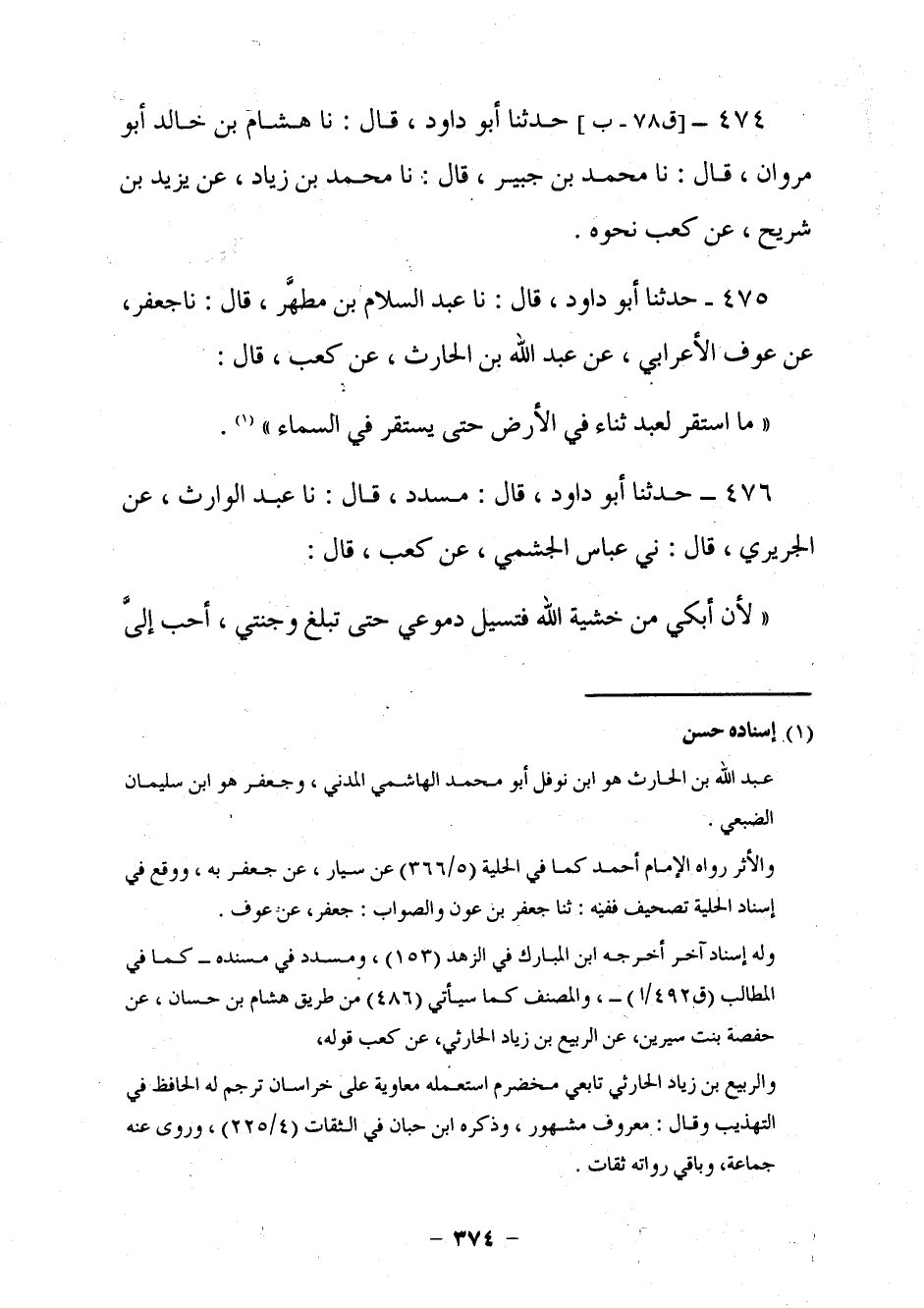 457 - حَدَّثَنَا أَبُو دَاوُدَ قَالَ: مُسَدَّدٌ قَالَ: نا عَبْدُ الْوَارِثِ، عَنِ الْجُرَيْرِيِّ، قَالَ: ني عَبَّاسٌ الْجُشَمِيُّ، عَنْ كَعْبٍ، قَالَ: §لِأَنْ أَبْكِيَ مِنْ خَشْيَةِ اللَّهِ فَتَسِيلُ دُمُوعِي حَتَّى تَبْلُغَ وَجْنَتَيَّ، أَحَبُّ إِلَيَّ -[375]- مِنْ أَنْ أَتَصَدَّقَ بِوَزْنِي ذَهَبًا