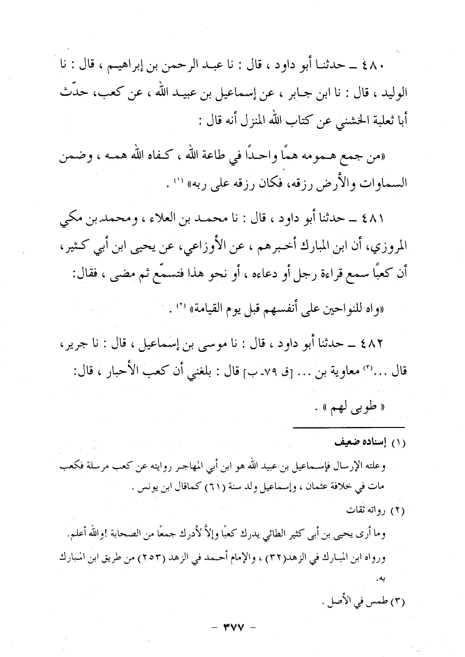 463 - حَدَّثَنَا أَبُو دَاوُدَ قَالَ: نا مُحَمَّدُ بْنُ الْعَلَاءِ، وَمُحَمَّدُ بْنُ مَكِّيٍّ الْمَرْوَزِيُّ، أَنَّ ابْنَ الْمُبَارَكِ، أَخْبَرَهُمْ عَنِ الْأَوْزَاعِيِّ، عَنْ يَحْيَى ابْنِ أَبِي كَثِيرٍ، §أَنَّ كَعْبًا سَمِعَ قِرَاءَةَ رَجُلٍ أَوْ دُعَاءَهُ، أَوْ نَحْوُ هَذَا، فَتَسَمَّعَ ثُمَّ مَضَى، فَقَالَ: وَاهٍ لِلنَّوَّاحِينَ عَلَى أَنْفُسِهِمْ قَبْلَ يَوْمِ الْقِيَامَةِ.