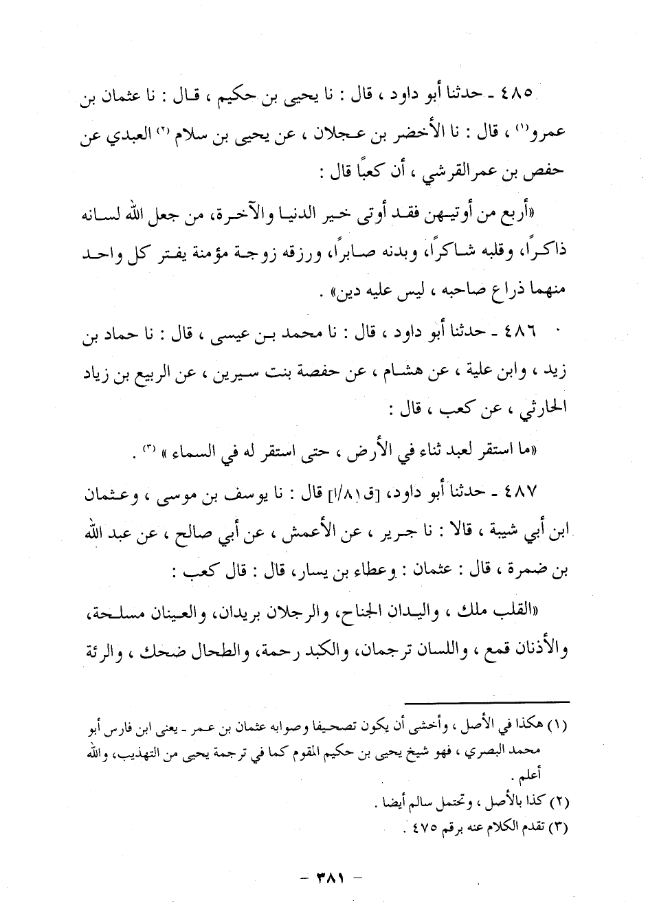 467 - حَدَّثَنَا أَبُو دَاوُدَ قَالَ: نا يَحْيَى بْنُ حَكِيمٍ، قَالَ: نا عُثْمَانُ بْنُ عَمْرٍو، قَالَ: نا الْأَخْضَرُ بْنُ عَجْلَانَ، عَنْ يَحْيَى بْنِ سَلَّامٍ الْعَبْدِيِّ، عَنْ حَفْصِ بْنِ عُمَرَ الْقُرَشِيِّ، أَنَّ كَعْبًا، قَالَ: §أَرْبَعٌ مَنْ أُوتِيَهُنَّ فَقَدْ أُوتِيَ خَيْرَ الدُّنْيَا وَالْآخِرَةِ، مَنْ جَعَلَ اللَّهُ لِسَانَهُ ذَاكِرًا، وَقَلْبَهُ شَاكِرًا، وَبَدَنَهُ صَابِرًا، وَرَزَقَهُ زَوْجَةً مُؤْمِنَةً يَفْتُرُ كُلُّ وَاحِدٍ مِنْهُمَا ذِرَاعَ صَاحِبِهِ، لَيْسَ عَلَيْهِ دَيْنٌ.