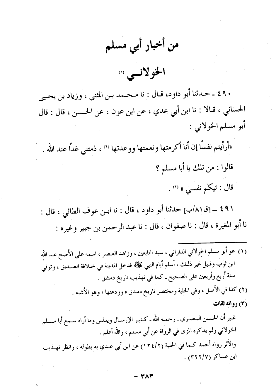 472 - حَدَّثَنَا أَبُو دَاوُدَ قَالَ: نا مُحَمَّدُ بْنُ الْمُثَنَّى، وَزِيَادُ بْنُ يَحْيَى الْحَسَّانِيُّ، قَالَا: نا ابْنُ أَبِي عَدِيٍّ، عَنِ ابْنِ عَوْنٍ، عَنِ الْحَسَنِ، قَالَ: قَالَ أَبُو مُسْلِمٍ الْخَوْلَانِيُّ: §أَرَأَيْتُمْ نَفْسًا إِنْ أَنَا أَكْرَمْتَهَا وَنَعَّمْتَهَا وَوَعَدْتَهَا ذَمَّتْنِي غَدًا عِنْدَ اللَّهِ. قَالُوا: مَنْ تِلْكَ يَا أَبَا مُسْلِمٍ؟ قَالَ: تِيكُمْ نَفْسِي.