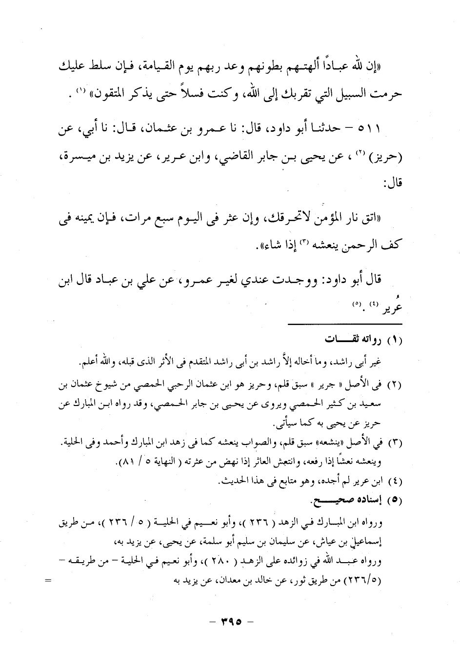 492 - حَدَّثَنَا أَبُو دَاوُدَ قَالَ: نا عَمْرُو بْنُ عُثْمَانَ، قَالَ: نا أَبِي، عَنْ حَرِيزٍ، عَنْ يَحْيَى بْنِ جَابِرٍ الْقَاضِي، وَابْنِ عَرِيرٍ، عَنْ يَزِيدَ بْنِ مَيْسَرَةَ، قَالَ: §اتَّقِ نَارَ الْمُؤْمِنِ لَا تُحْرِقُكَ، وَإِنْ عَثَرَ فِي الْيَوْمِ سَبْعَ مَرَّاتٍ، فَإِنَّ يَمِينَهُ فِي كَفِّ الرَّحْمَنِ يُنْعِشُهُ إِذَا شَاءَ. قَالَ أَبُو دَاوُدَ: وَوَجَدْتُ عِنْدِي لِغَيْرِ عَمْرٍو، عَنْ عَلِيِّ بْنِ عَبَّادٍ قَالَ: ابْنُ عَرِيرٍ.