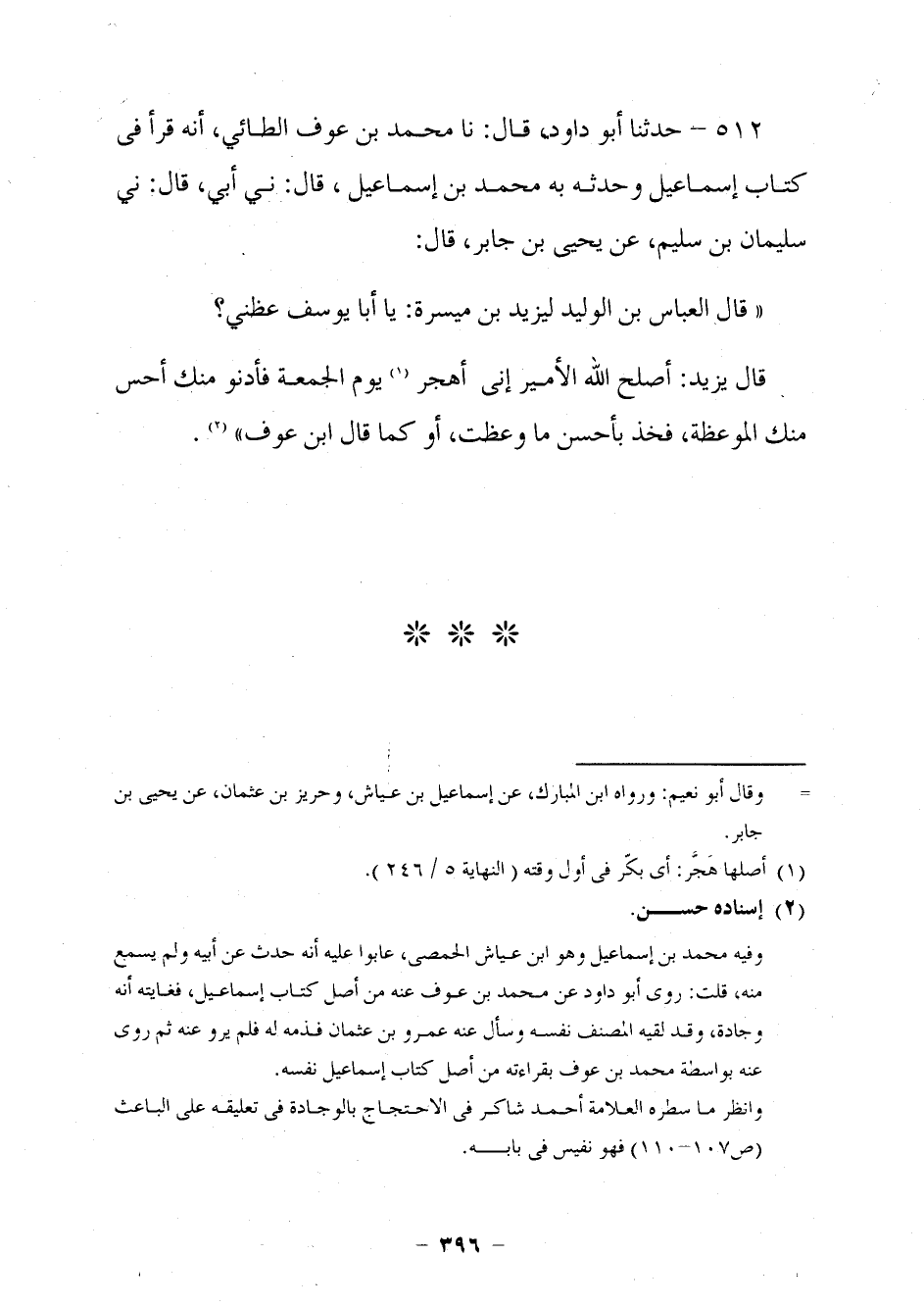 493 - حَدَّثَنَا أَبُو دَاوُدَ قَالَ: نا مُحَمَّدُ بْنُ عَوْفٍ الطَّائِيُّ، أَنَّهُ قَرَأَ فِي كِتَابِ إِسْمَاعِيلَ وَحَدَّثَهُ بِهِ مُحَمَّدُ بْنُ إِسْمَاعِيلَ قَالَ: ني أَبِي قَالَ: ني سُلَيْمَانُ بْنُ سُلَيْمٍ، عَنْ يَحْيَى بْنِ جَابِرٍ قَالَ: §قَالَ الْعَبَّاسُ بْنُ الْوَلِيدِ لِيَزِيدَ بْنِ مَيْسَرَةَ: يَا أَبَا يُوسُفَ عِظْنِي؟ قَالَ يَزِيدُ: أَصْلَحَ اللَّهُ الْأَمِيرَ إِنَّى أَهَجُرُ يَوْمَ الْجُمُعَةِ فَأَدْنُو مِنْكَ أُحِسُّ مِنْكَ الْمَوْعِظَةَ، فَخُذْ بِأَحْسَنَ مَا وَعَظْتَ. أَوْ كَمَا قَالَ ابْنُ عَوْفٍ.