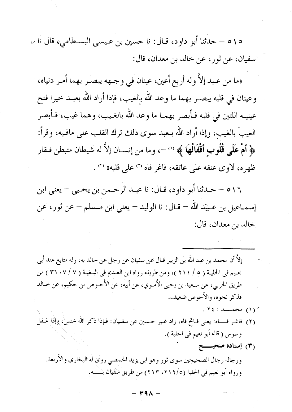 496 - حَدَّثَنَا أَبُو دَاوُدَ قَالَ: نا حُسَيْنُ بْنُ عِيسَى الْبِسْطَامِيُّ، قَالَ: نا سُفْيَانُ، عَنْ ثَوْرٍ، عَنْ خَالِدِ بْنِ مَعْدَانَ، قَالَ: §مَا مِنْ عَبْدٍ إِلَّا وَلَهُ أَرْبَعُ أَعْيُنٍ، عَيْنَانِ فِي وَجْهِهِ يُبْصِرُ بِهِمَا أَمْرَ دُنْيَاهُ، وَعَيْنَانِ فِي قَلْبِهِ يُبْصِرُ بِهِمَا مَا وَعَدَ اللَّهُ بِالْغَيْبِ، فَإِذَا أَرَادَ اللَّهُ بِعَبْدٍ خَيْرًا فَتَحَ عَيْنَيْهِ اللَّتَيْنِ فِي قَلْبِهِ فَأَبْصَرَ بِهِمَا مَا وَعَدَ اللَّهُ بِالْغَيْبِ، وَهُمَا غَيْبٌ، فَأَبْصَرَ الْغَيْبَ بِالْغَيْبِ، وَإِذَا أَرَادَ اللَّهُ بِعَبْدٍ سِوَى ذَلِكَ تَرَكَ الْقَلْبَ عَلَى مَا فِيهِ، وَقَرَأَ: {أَمْ عَلَى قُلُوبٍ أَقْفَالُهَا} [محمد: 24] ، وَمَا مِنْ إِنْسَانٍ إِلَّا لَهُ شَيْطَانٌ مُتَبَطِّنٌ فَقَارَ ظَهْرِهِ، لَاوِيَ عُنُقَهُ عَلَى عَاتِقِهِ، فَاغِرَ فَاهُ عَلَى قَلْبِهِ.