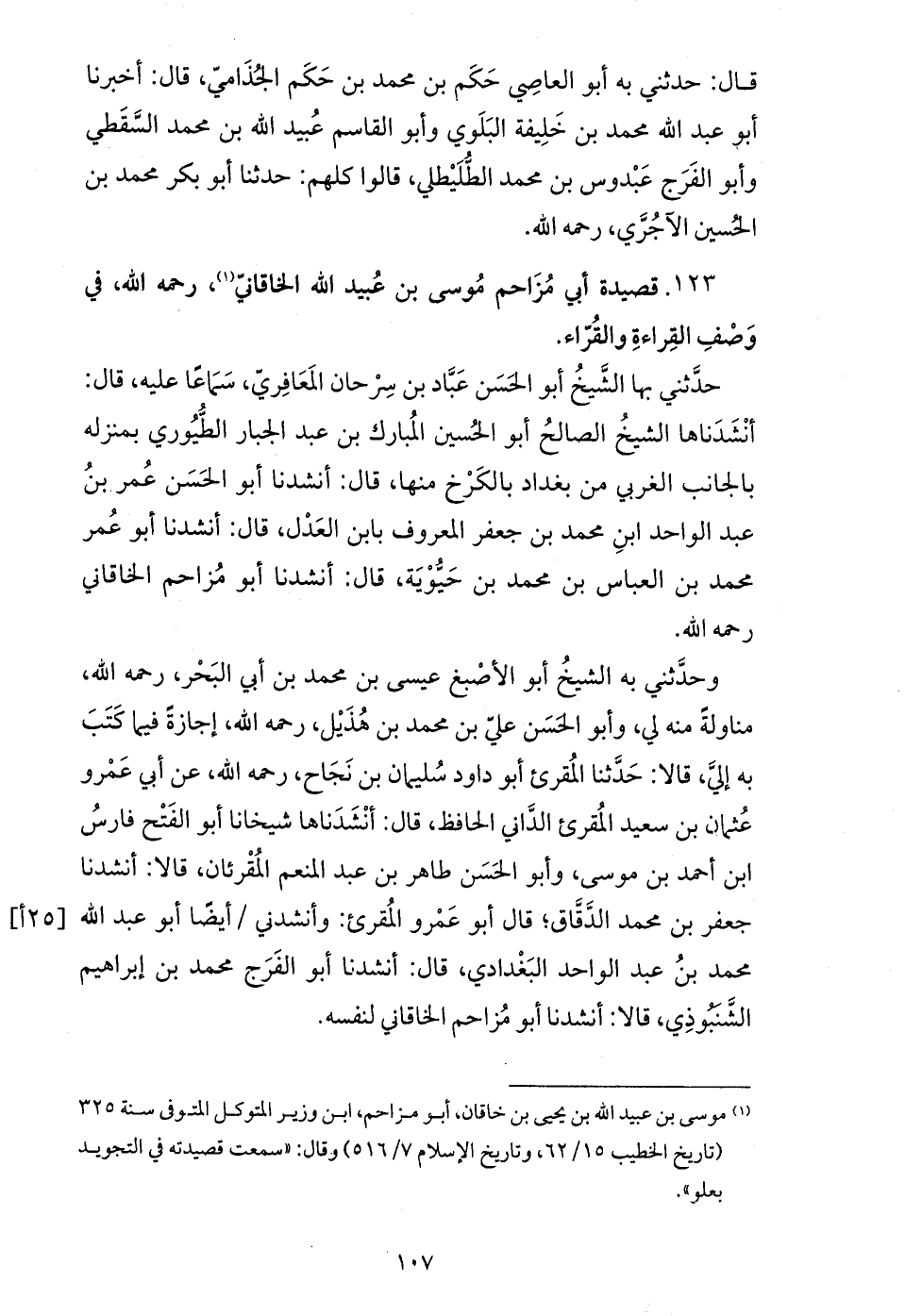 (¬1) موسى بن عبيد الله بن يحيى بن خاقان، أبو مزاحم، ابن وزير المتوكل المتوفى سنة 325 (تاريخ الخطيب 15/ 62، وتاريخ الإسلام 7/ 516) وقال: «سمعت قصيدته في التجويد بعلو».