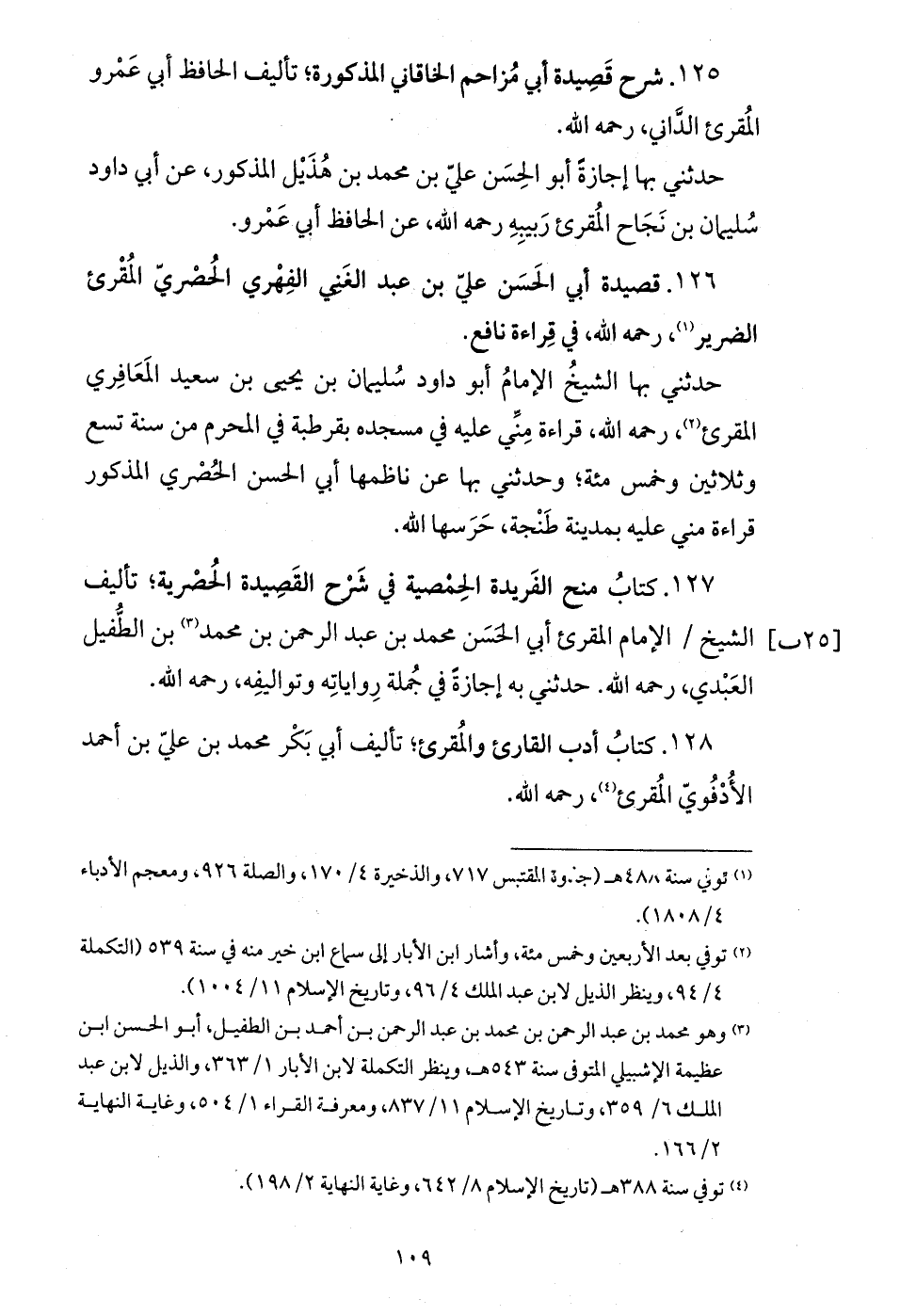 حدثني بها الشيخ الإمام أبو داود سليمان بن يحيى بن سعيد المعافري المقرئ (¬2)، رحمه الله، قراءة منّي عليه في مسجده بقرطبة في المحرم من سنة تسع وثلاثين وخمس مئة؛ وحدثني بها عن ناظمها أبي الحسن الحصري المذكور قراءة مني عليه بمدينة طنجة، حرسها الله.