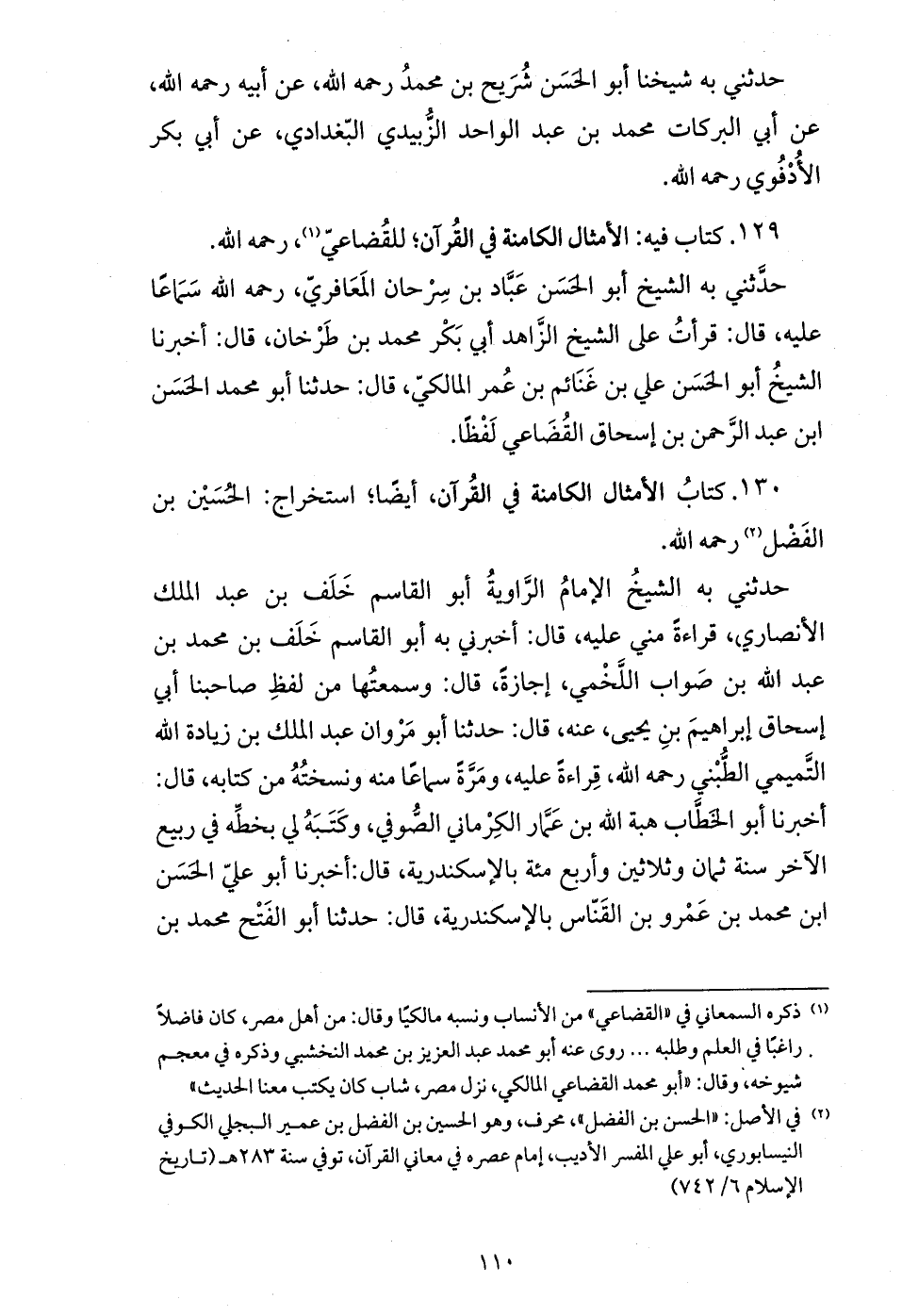 حدثني به الشيخ الإمام الرّواية أبو القاسم خلف بن عبد الملك الأنصاري، قراءة مني عليه، قال: أخبرني به أبو القاسم خلف بن محمد بن عبد الله بن صواب اللّخمي، إجازة، قال: وسمعتها من لفظ صاحبنا أبي إسحاق إبراهيم بن يحيى، عنه، قال: حدثنا أبو مروان عبد الملك بن زيادة الله التّميمي الطّبني رحمه الله، قراءة عليه، ومرّة سماعا منه ونسخته من كتابه، قال: أخبرنا أبو الخطّاب هبة الله بن عمّار الكرماني الصّوفي، وكتبه لي بخطّه في ربيع الآخر سنة ثمان وثلاثين وأربع مئة بالإسكندرية، قال: أخبرنا أبو عليّ الحسن ابن محمد بن عمرو بن القنّاس بالإسكندرية، قال: حدثنا أبو الفتح محمد بن