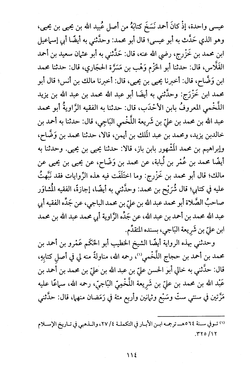 عيسى واحدة، إذ كان أحمد نسخ كتابه من أصل عبيد الله بن يحيى بن يحيى، وهو الذي حدّث به أبو عيسى؛ قال أبو محمد: وحدّثني به أيضا أبي إسماعيل ابن محمد بن خزرج، رضي الله عنه، قال: حدّثني به أبو عثمان سعيد بن أحمد القلاّس، قال: حدثنا أبو الحزم وهب بن مسرّة الحجاري، قال: حدثنا محمد ابن وضّاح، قال: أخبرنا يحيى بن يحيى، قال: أخبرنا مالك بن أنس؛ قال أبو محمد ابن خزرج: وحدّثني به أيضا أبو عبد الله محمد بن عبد الله بن يزيد اللّخمي المعروف بابن الأحدب، قال: حدثنا به الفقيه الرّواية أبو محمد عبد الله بن محمد بن عليّ بن شريعة اللّخمي الباجي، قال: حدثنا به أحمد بن خالد بن يزيد، ومحمد بن عبد الملك بن أيمن، قالا، حدثنا محمد بن وضّاح، وإبراهيم بن محمد المشهور بابن باز، قالا: حدثنا يحيى بن يحيى. وحدثنا به أيضا محمد بن عمر بن لبابة، عن محمد بن وضّاح، عن يحيى بن يحيى عن مالك؛ قال أبو محمد بن خزرج: وما اختلفت فيه هذه الرّوايات فقد نبّهت عليه في كتابي؛ قال شريح بن محمد: وحدّثني به أيضا، إجازة، الفقيه المشاور صاحب الصّلاة أبو محمد عبد الله بن عليّ بن محمد الباجي، عن جدّه الفقيه أبي عبد الله محمد بن أحمد بن عبد الله، عن جدّه الرّاوية أبي محمد عبد الله بن محمد ابن عليّ بن شريعة الباجي، بسنده المتقدّم.