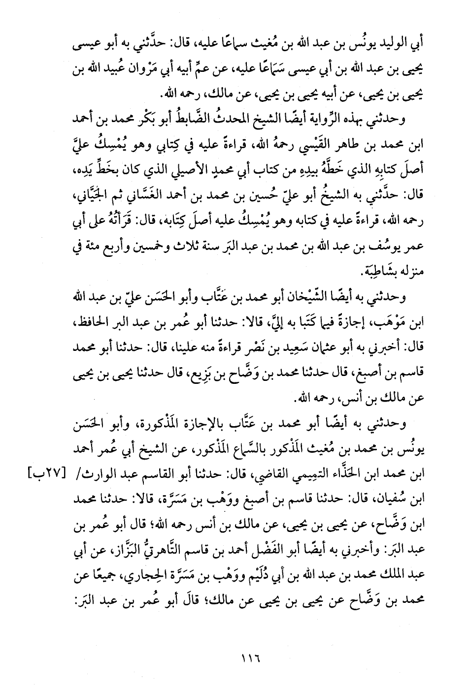 وحدثني به أيضا الشّيخان أبو محمد بن عتّاب وأبو الحسن عليّ بن عبد الله ابن موهب، إجازة فيما كتبا به إليّ، قالا: حدثنا أبو عمر بن عبد البر الحافظ، قال: أخبرني به أبو عثمان سعيد بن نصر قراءة منه علينا، قال: حدثنا أبو محمد قاسم بن أصبغ، قال حدثنا محمد بن وضّاح بن بزيع، قال حدثنا يحيى بن يحيى عن مالك بن أنس، رحمه الله.