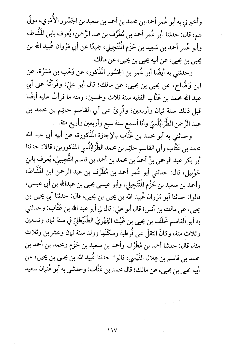 وحدثني به أبو محمد بن عتّاب بالإجازة المذكورة، عن أبيه أبي عبد الله محمد بن عتّاب وأبي القاسم حاتم بن محمد الطّرابلسي المذكورين، قالا: حدثنا أبو بكر عبد الرحمن بن أحمد بن محمد بن أحمد بن قاسم التّجيبيّ، يعرف بابن حوبيل، قال: حدثني أبو عمر أحمد بن مطرّف بن عبد الرحمن ابن المشّاط، وأحمد بن سعيد بن حزم المنتجيلي، وأبو عيسى يحيى بن عبد الله بن أبي عيسى، قالوا: حدثنا أبو مروان عبيد الله بن يحيى بن يحيى، قال: حدثنا أبي يحيى بن يحيى، عن مالك بن أنس؛ قال أبو علي: قال لي أبو عبد الله بن عتّاب: وحدثني به أبو القاسم خلف بن يحيى بن غيث الفهريّ الطليطليّ في سنة ثمان وتسعين وثلاث مئة، وكان انتقل على قرطبة وسكنها وولد سنة ثمان وعشرين وثلاث مئة، قال: حدثنا أحمد بن مطرّف وأحمد بن سعيد بن حزم ومحمد بن أحمد بن محمد بن قاسم بن هلال القيسي، قالوا: حدثنا عبيد الله بن يحيى بن يحيى، عن أبيه يحيى بن يحيى، عن مالك؛ قال محمد بن عتّاب: وحدثني به أبو عثمان سعيد