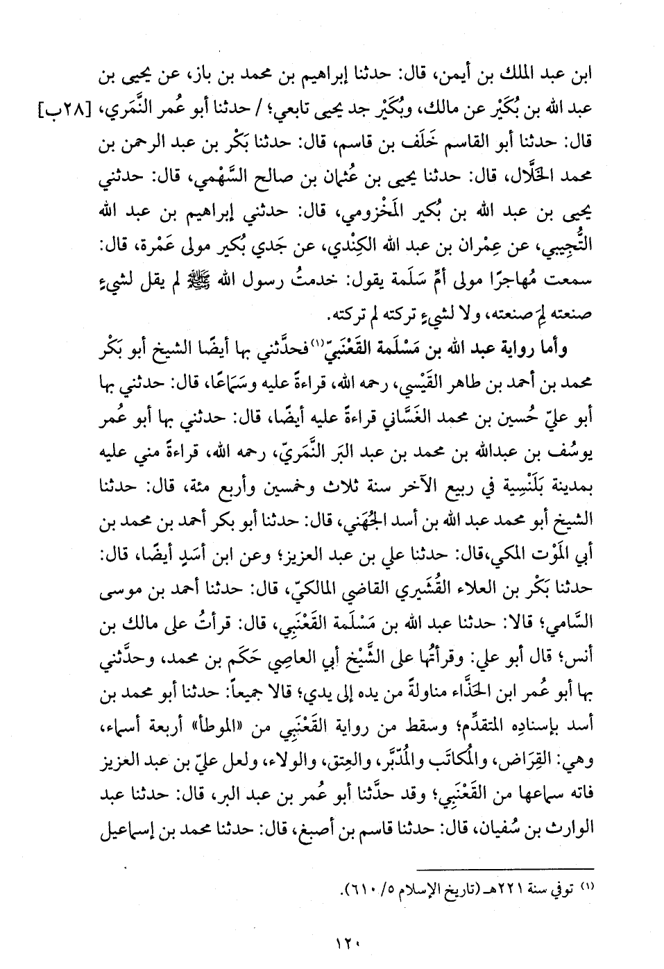 * وأما رواية عبد الله بن مسلمة القعنبيّ (¬1) فحدّثني بها أيضا الشيخ أبو بكر محمد بن أحمد بن طاهر القيسي، رحمه الله، قراءة عليه وسماعا، قال: حدثني بها أبو عليّ حسين بن محمد الغسّاني قراءة عليه أيضا، قال: حدثني بها أبو عمر يوسف بن عبد الله بن محمد بن عبد البر النّمريّ، رحمه الله، قراءة مني عليه بمدينة بلنسية في ربيع الآخر سنة ثلاث وخمسين وأربع مئة، قال: حدثنا الشيخ أبو محمد عبد الله بن أسد الجهني، قال: حدثنا أبو بكر أحمد بن محمد بن أبي الموت المكي، قال: حدثنا علي بن عبد العزيز؛ وعن ابن أسد أيضا، قال: حدثنا بكر بن العلاء القشيري القاضي المالكيّ، قال: حدثنا أحمد بن موسى السّامي؛ قالا: حدثنا عبد الله بن مسلمة القعنبي، قال: قرأت على مالك بن أنس؛ قال أبو علي: وقرأتها على الشّيخ أبي العاصي حكم بن محمد، وحدّثني بها أبو عمر ابن الحذّاء مناولة من يده إلى يدي؛ قالا جميعا: حدثنا أبو محمد بن أسد بإسناده المتقدّم؛ وسقط من رواية القعنبي من «الموطأ» أربعة أسماء، وهي: القراض، والمكاتب والمدّبّر، والعتق، والولاء، ولعل عليّ بن عبد العزيز فاته سماعها من القعنبي؛ وقد حدّثنا أبو عمر بن عبد البر، قال: حدثنا عبد الوارث بن سفيان، قال: حدثنا قاسم بن أصبغ، قال: حدثنا محمد بن إسماعيل