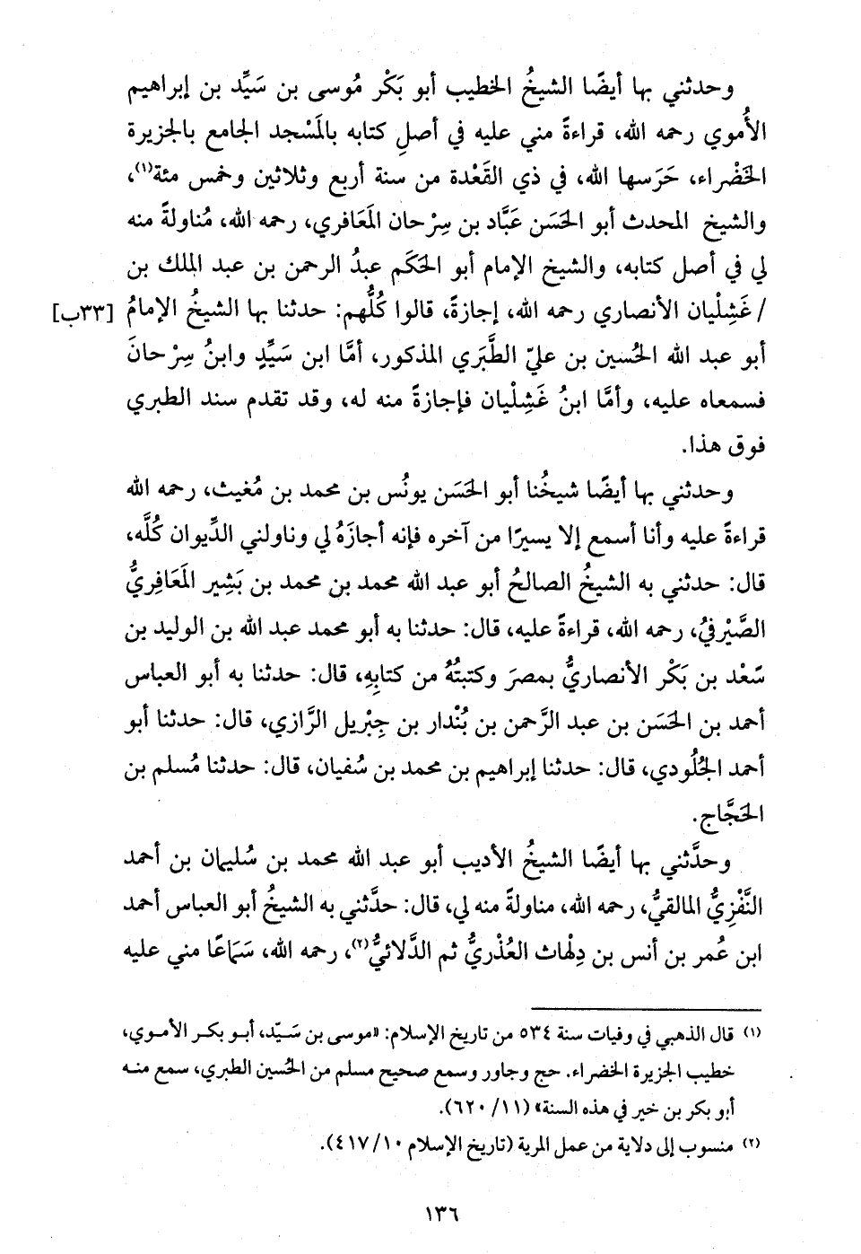 وحدثني بها أيضا الشيخ الخطيب أبو بكر موسى بن سيّد بن إبراهيم الأموي رحمه الله، قراءة مني عليه في أصل كتابه بالمسجد الجامع بالجزيرة الخضراء، حرسها الله، في ذي القعدة من سنة أربع وثلاثين وخمس مئة (¬1)، والشيخ المحدث أبو الحسن عبّاد بن سرحان المعافري، رحمه الله، مناولة منه لي في أصل كتابه، والشيخ الإمام أبو الحكم عبد الرحمن بن عبد الملك بن / غشليان الأنصاري رحمه الله، إجازة، قالوا كلّهم: حدثنا بها الشيخ الإمام أبو عبد الله الحسين بن عليّ الطّبري المذكور، أمّا ابن سيّد وابن سرحان فسمعاه عليه، وأمّا ابن غشليان فإجازة منه له، وقد تقدم سند الطبري فوق هذا.