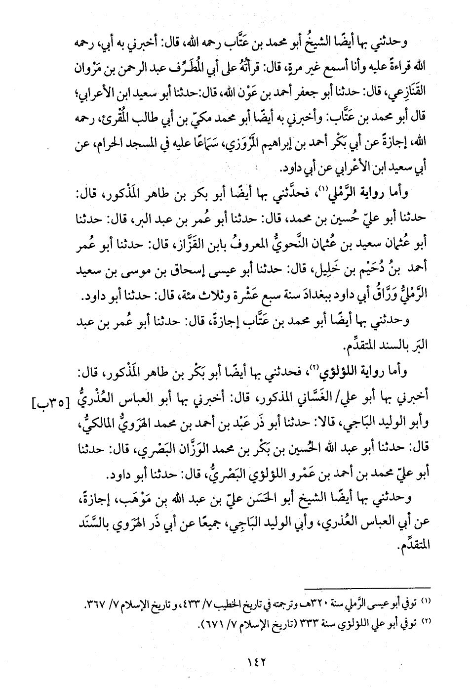 وحدثني بها أيضا الشيخ أبو محمد بن عتّاب رحمه الله، قال: أخبرني به أبي، رحمه الله قراءة عليه وأنا أسمع غير مرة، قال: قرأته على أبي المطرّف عبد الرحمن بن مروان القنازعي، قال: حدثنا أبو جعفر أحمد بن عون الله، قال: حدثنا أبو سعيد ابن الأعرابي؛ قال أبو محمد بن عتّاب: وأخبرني به أيضا أبو محمد مكيّ بن أبي طالب المقرئ، رحمه الله، إجازة عن أبي بكر أحمد بن إبراهيم المروزي، سماعا عليه في المسجد الحرام، عن أبي سعيد ابن الأعرابي عن أبي داود.