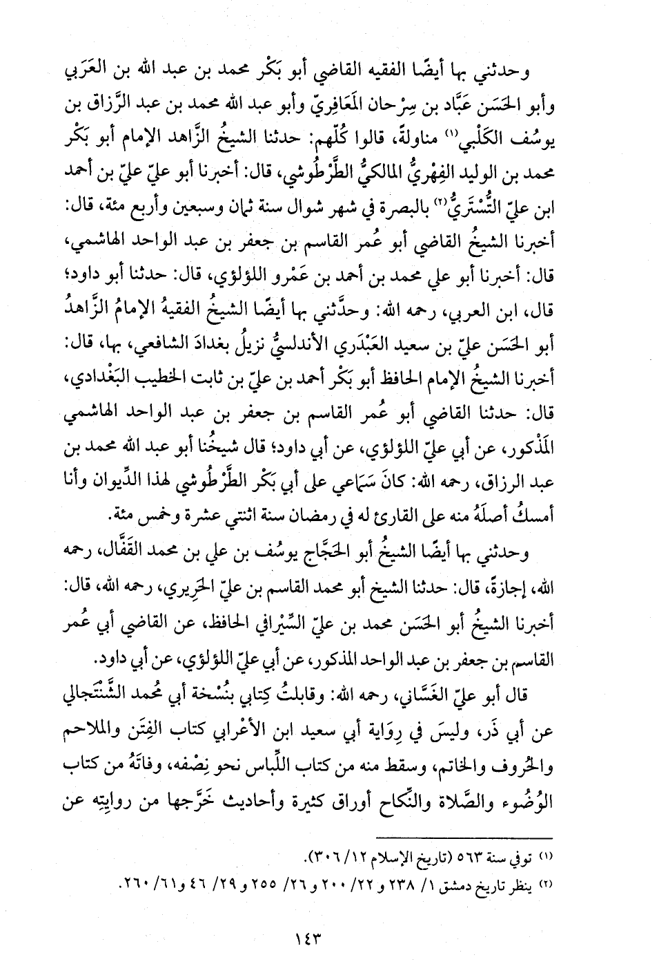 وحدثني بها أيضا الشيخ أبو الحجّاج يوسف بن علي بن محمد القفّال، رحمه الله، إجازة، قال: حدثنا الشيخ أبو محمد القاسم بن عليّ الحريري، رحمه الله، قال: أخبرنا الشيخ أبو الحسن محمد بن عليّ السّيرافي الحافظ، عن القاضي أبي عمر القاسم بن جعفر بن عبد الواحد المذكور، عن أبي عليّ اللؤلؤي، عن أبي داود.