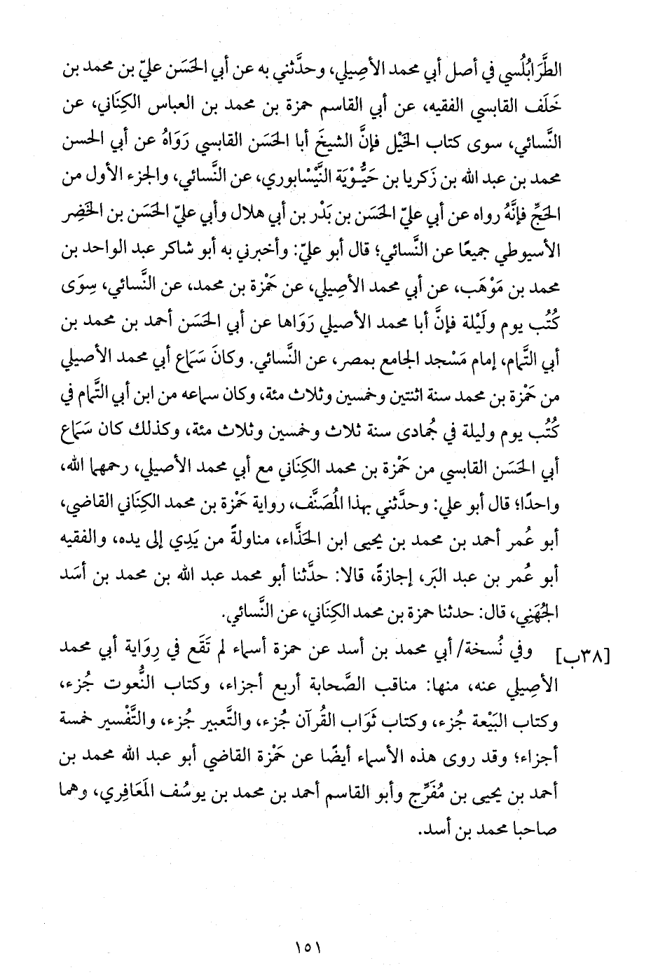 الطّرابلسي في أصل أبي محمد الأصيلي، وحدّثني به عن أبي الحسن عليّ بن محمد بن خلف القابسي الفقيه، عن أبي القاسم حمزة بن محمد بن العباس الكناني، عن النّسائي، سوى كتاب الخيل فإنّ الشيخ أبا الحسن القابسي رواه عن أبي الحسن محمد بن عبد الله بن زكريا بن حيّوية النّيسابوري، عن النّسائي، والجزء الأول من الحجّ فإنّه رواه عن أبي عليّ الحسن بن بدر بن أبي هلال وأبي عليّ الحسن بن الخضر الأسيوطي جميعا عن النّسائي؛ قال أبو عليّ: وأخبرني به أبو شاكر عبد الواحد بن محمد بن موهب، عن أبي محمد الأصيلي، عن حمزة بن محمد، عن النّسائي، سوى كتب يوم وليلة فإنّ أبا محمد الأصيلي رواها عن أبي الحسن أحمد بن محمد بن أبي التّمام، إمام مسجد الجامع بمصر، عن النّسائي. وكان سماع أبي محمد الأصيلي من حمزة بن محمد سنة اثنتين وخمسين وثلاث مئة، وكان سماعه من ابن أبي التّمام في كتب يوم وليلة في جمادى سنة ثلاث وخمسين وثلاث مئة، وكذلك كان سماع أبي الحسن القابسي من حمزة بن محمد الكناني مع أبي محمد الأصيلي، رحمهما الله، واحدا؛ قال أبو علي: وحدّثني بهذا المصنّف، رواية حمزة بن محمد الكناني القاضي، أبو عمر أحمد بن محمد بن يحيى ابن الحذّاء، مناولة من يدي إلى يده، والفقيه أبو عمر بن عبد البر، إجازة، قالا: حدّثنا أبو محمد عبد الله بن محمد بن أسد الجهني، قال: حدثنا حمزة بن محمد الكناني، عن النّسائي.