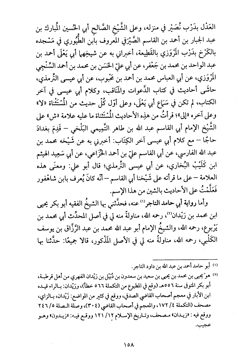 العدل بدرب نصير في منزله، وعلى الشّيخ الصّالح أبي الحسين المبارك بن عبد الجبار بن أحمد بن القاسم الصّيرفي المعروف بابن الطّيوري في مسجده بالكرخ بدرب المروزي بالقطيعة، أخبراني به عن شيخهما أبي يعلى أحمد بن عبد الواحد بن محمد بن جعفر، عن أبي عليّ الحسن بن محمد بن أحمد السّنجي المروزي، عن أبي العباس محمد بن أحمد بن محبوب، عن أبي عيسى التّرمذي، حاشى أحاديث في كتاب الدّعوات والمناقب، وكلام أبي عيسى في آخر الكتاب، لم تكن في سماع أبي يعلى، وعلى أوّل كلّ حديث من المستثناة «لا» وعلى آخره «إلى»؛ قرأت من هذه الأحاديث المستثناة ما عليه علامة «ش» على الشّيخ الإمام أبي القاسم عبد الله بن طاهر التّميمي البلخي - قدم بغداد حاجا - مع كلام أبي عيسى آخر الكتاب: أخبرني به عن شيخه محمد بن عبد الله الفارسي، عن أبي القاسم عليّ بن أحمد الخزاعي، عن أبي سعيد الهيثم ابن كليب البخاري، عن أبي عيسى التّرمذي؛ قال أبو علي: ومعنى هذه العلامة - على ما قرأته على شيخنا أبي القاسم - أنّه كان يعرف بابن شاهفور فعلّمت على الأحاديث بالشين من هذا الإسم.