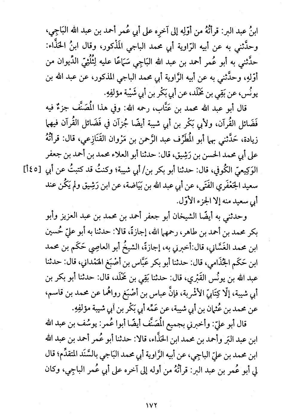 قال أبو عبد الله محمد بن عتّاب، رحمه الله: وفي هذا المصنّف جزء فيه فضائل القرآن، ولأبي بكر بن أبي شيبة أيضا جزآن في فضائل القرآن فيهما زيادة، حدّثني بهما أبو المطرّف عبد الرّحمن بن مروان القنازعي، قال: قرأته على أبي محمد الحسن بن رشيق، قال: حدثنا أبو العلاء محمد بن أحمد بن جعفر الوكيعيّ الكوفي، قال: حدثنا أبو بكر بن / أبي شيبة؛ وكنت قد كتبت عن أبي سعيد الجعفري الفتى، عن أبي عبد الله بن بياضة، عن ابن رشيق ولم يكن عند أبي سعيد منه إلا الجزء الأوّل.