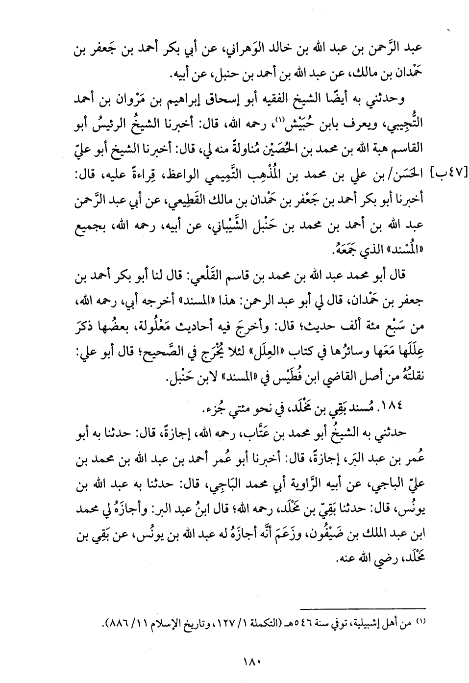 عبد الرّحمن بن عبد الله بن خالد الوهراني، عن أبي بكر أحمد بن جعفر بن حمدان بن مالك، عن عبد الله بن أحمد بن حنبل، عن أبيه.
