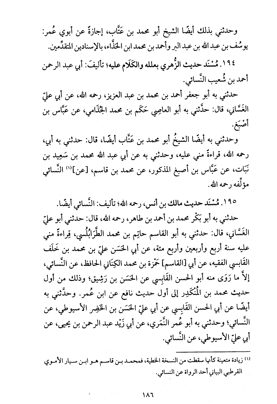 حدثني به أبو بكر محمد بن أحمد بن طاهر، رحمه الله، قال: حدثني أبو عليّ الغسّاني، قال: حدثني به أبو القاسم حاتم بن محمد الطّرابلسي، قراءة مني عليه سنة أربع وأربعين وأربع مئة، عن أبي الحسن عليّ بن محمد بن خلف القابسي الفقيه، عن أبي [القاسم] حمزة بن محمد الكناني الحافظ، عن النّسائي، إلاّ ما روى منه أبو الحسن القابسي عن الحسن بن رشيق؛ وذلك من أول حديث محمد بن المنكدر إلى أول حديث نافع عن ابن عمر. وحدّثني به أيضا عن أبي الحسن القابسي عن أبي عليّ الحسن بن الخضر الأسيوطي، عن النّسائي؛ وحدثني به أبو عمر النّمري، عن أبي زيد عبد الرحمن بن يحيى، عن أبي عليّ الأسيوطي، عن النّسائي.