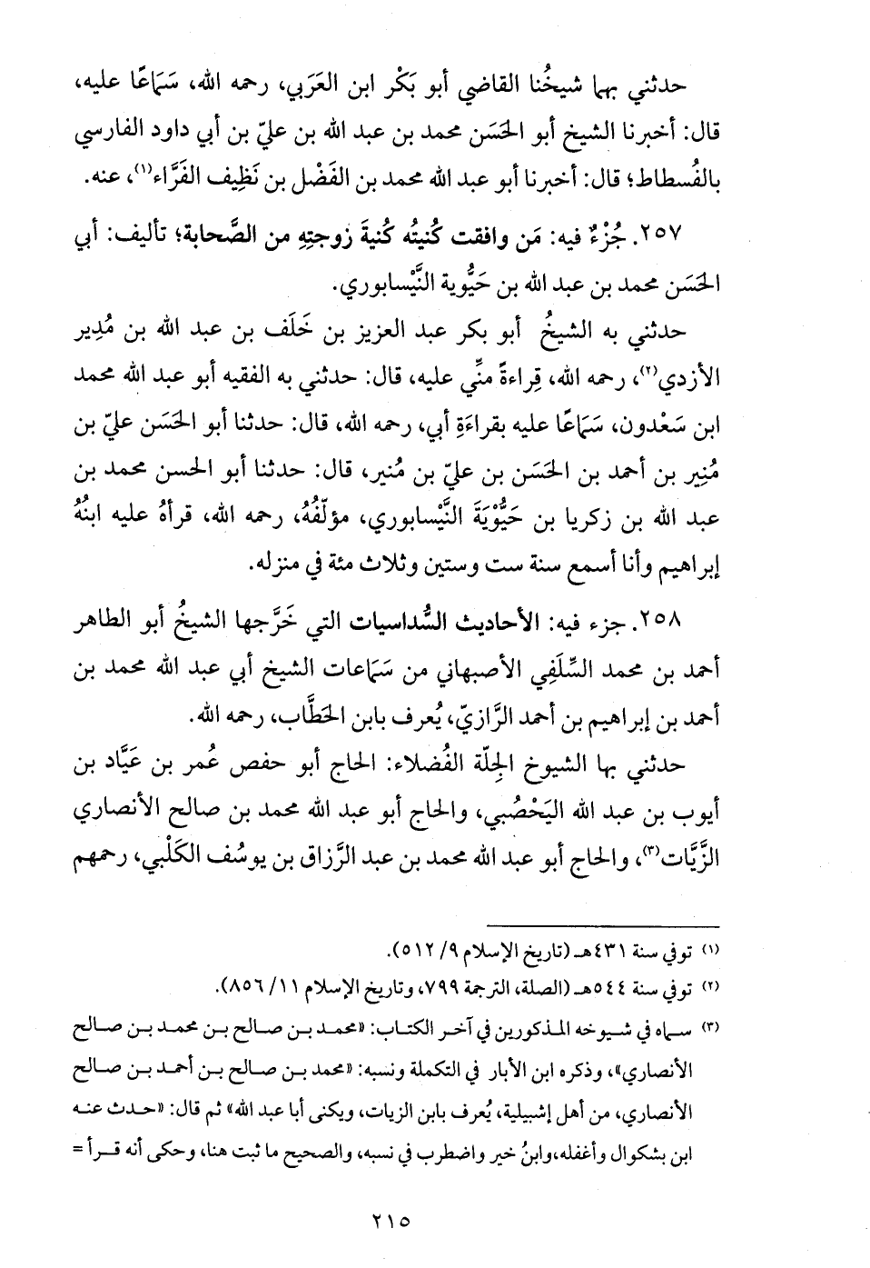 حدثني بهما شيخنا القاضي أبو بكر ابن العربي، رحمه الله، سماعا عليه، قال: أخبرنا الشيخ أبو الحسن محمد بن عبد الله بن عليّ بن أبي داود الفارسي بالفسطاط؛ قال: أخبرنا أبو عبد الله محمد بن الفضل بن نظيف الفرّاء (¬1)، عنه.