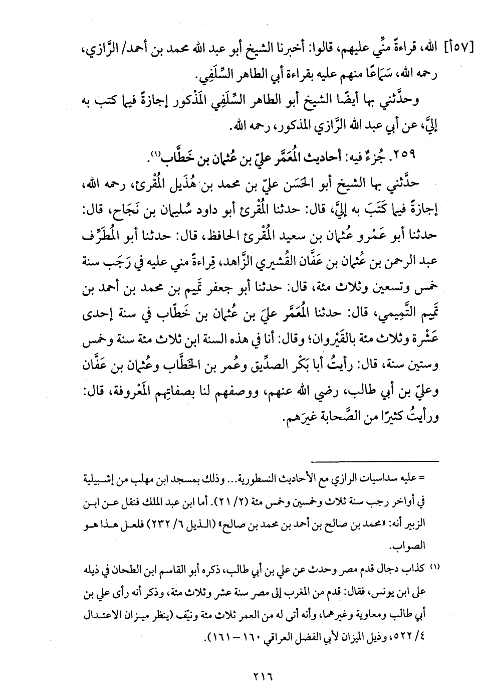 حدّثني بها الشيخ أبو الحسن عليّ بن محمد بن هذيل المقرئ، رحمه الله، إجازة فيما كتب به إليّ، قال: حدثنا المقرئ أبو داود سليمان بن نجاح، قال: حدثنا أبو عمرو عثمان بن سعيد المقرئ الحافظ، قال: حدثنا أبو المطرّف عبد الرحمن بن عثمان بن عفّان القشيري الزّاهد، قراءة مني عليه في رجب سنة خمس وتسعين وثلاث مئة، قال: حدثنا أبو جعفر تميم بن محمد بن أحمد بن تميم التّميمي، قال: حدثنا المعمّر علي بن عثمان بن خطّاب في سنة إحدى عشرة وثلاث مئة بالقيروان؛ وقال: أنا في هذه السنة ابن ثلاث مئة سنة وخمس وستين سنة، قال: رأيت أبا بكر الصدّيق وعمر بن الخطّاب وعثمان بن عفّان وعليّ بن أبي طالب، رضي الله عنهم، ووصفهم لنا بصفاتهم المعروفة، قال: ورأيت كثيرا من الصّحابة غيرهم.
