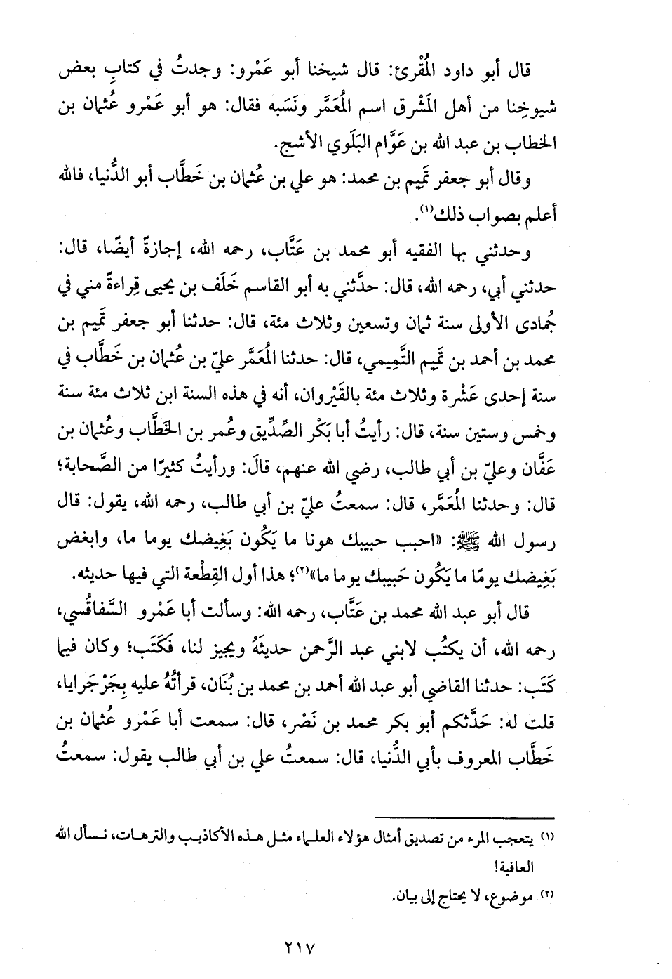وحدثني بها الفقيه أبو محمد بن عتّاب، رحمه الله، إجازة أيضا، قال: حدثني أبي، رحمه الله، قال: حدّثني به أبو القاسم خلف بن يحيى قراءة مني في جمادى الأولى سنة ثمان وتسعين وثلاث مئة، قال: حدثنا أبو جعفر تميم بن محمد بن أحمد بن تميم التّميمي، قال: حدثنا المعمّر عليّ بن عثمان بن خطّاب في سنة إحدى عشرة وثلاث مئة بالقيروان، أنه في هذه السنة ابن ثلاث مئة سنة وخمس وستين سنة، قال: رأيت أبا بكر الصّدّيق وعمر بن الخطّاب وعثمان بن عفّان وعليّ بن أبي طالب، رضي الله عنهم، قال: ورأيت كثيرا من الصّحابة؛ قال: وحدثنا المعمّر، قال: سمعت عليّ بن أبي طالب، رحمه الله، يقول: قال رسول الله صلّى الله عليه وسلّم: «احبب حبيبك هونا ما يكون بغيضك يوما ما، وابغض بغيضك يوما ما يكون حبيبك يوما ما» (¬2)؛ هذا أول القطعة التي فيها حديثه.