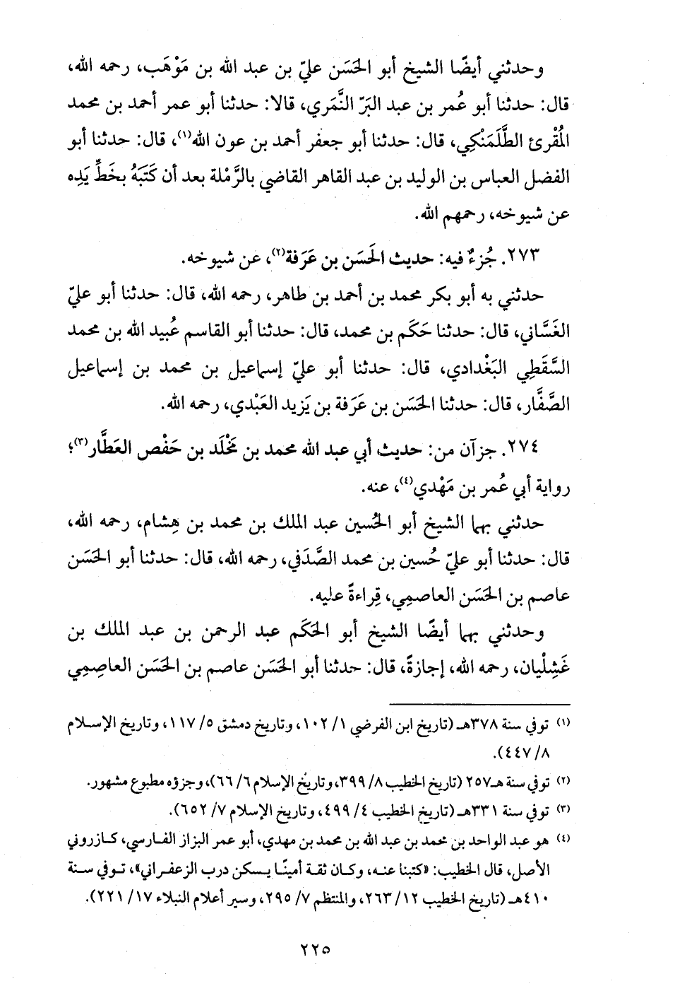 حدثني به أبو بكر محمد بن أحمد بن طاهر، رحمه الله، قال: حدثنا أبو عليّ الغسّاني، قال: حدثنا حكم بن محمد، قال: حدثنا أبو القاسم عبيد الله بن محمد السّقطي البغدادي، قال: حدثنا أبو عليّ إسماعيل بن محمد بن إسماعيل الصّفّار، قال: حدثنا الحسن بن عرفة بن يزيد العبدي، رحمه الله.