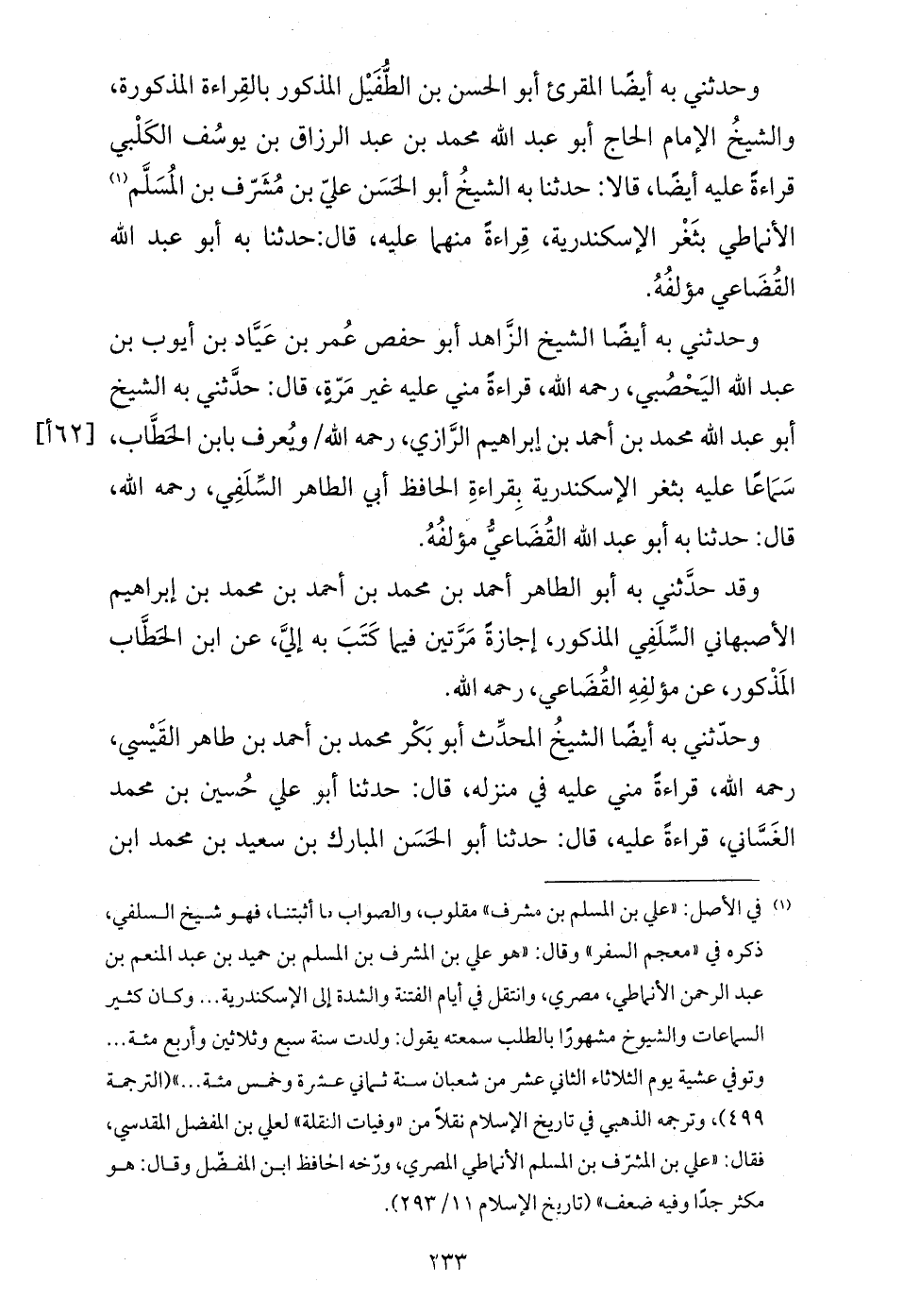 وحدثني به أيضا الشيخ الزّاهد أبو حفص عمر بن عيّاد بن أيوب بن عبد الله اليحصبي، رحمه الله، قراءة مني عليه غير مرّة، قال: حدّثني به الشيخ أبو عبد الله محمد بن أحمد بن إبراهيم الرّازي، رحمه الله / ويعرف بابن الحطّاب، سماعا عليه بثغر الإسكندرية بقراءة الحافظ أبي الطاهر السّلفي، رحمه الله، قال: حدثنا به أبو عبد الله القضاعيّ مؤلفه.