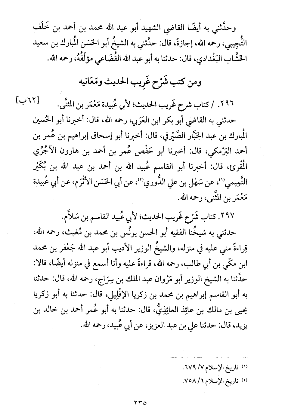 حدثني به شيخنا الفقيه أبو الحسن يونس بن محمد بن مغيث، رحمه الله، قراءة مني عليه في منزله، والشيخ الوزير الأديب أبو عبد الله جعفر بن محمد ابن مكّي بن أبي طالب، رحمه الله، قراءة عليه وأنا أسمع في منزله أيضا، قالا: حدّثنا به الشيخ الوزير أبو مروان عبد الملك بن سراج، رحمه الله، قال: حدثنا به أبو القاسم إبراهيم بن محمد بن زكريا الإفليلي، قال: حدثنا به أبو زكريا يحيى بن مالك بن عائذ العائذيّ، قال: حدثنا به أبو عمر أحمد بن خالد بن يزيد، قال: حدثنا علي بن عبد العزيز، عن أبي عبيد، رحمه الله.