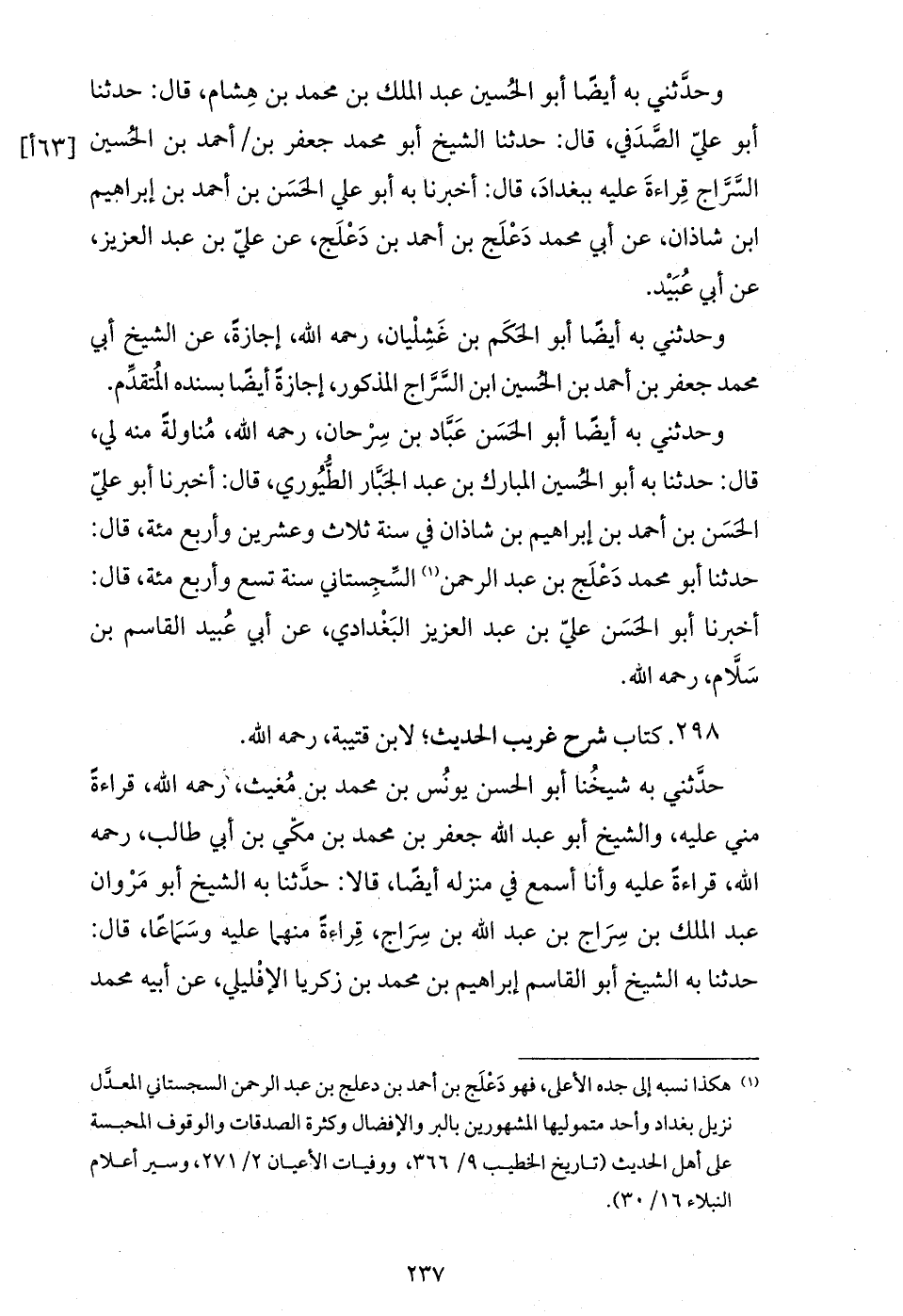 وحدّثني به أيضا أبو الحسين عبد الملك بن محمد بن هشام، قال: حدثنا أبو عليّ الصّدفي، قال: حدثنا الشيخ أبو محمد جعفر بن / أحمد بن الحسين السّرّاج قراءة عليه ببغداد، قال: أخبرنا به أبو علي الحسن بن أحمد بن إبراهيم ابن شاذان، عن أبي محمد دعلج بن أحمد بن دعلج، عن عليّ بن عبد العزيز، عن أبي عبيد.