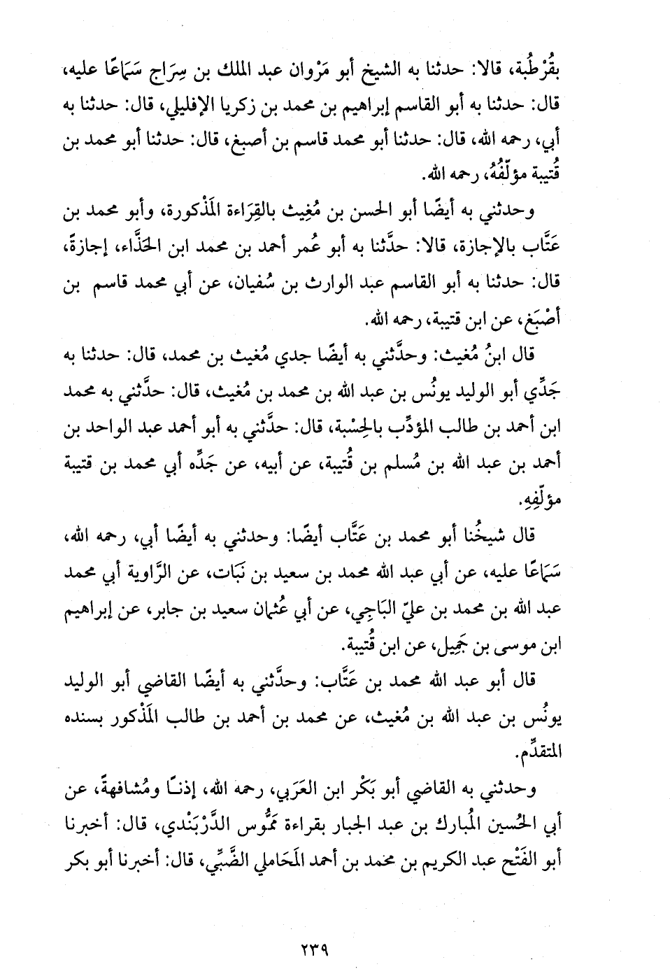 وحدثني به أيضا أبو الحسن بن مغيث بالقراءة المذكورة، وأبو محمد بن عتّاب بالإجازة، قالا: حدّثنا به أبو عمر أحمد بن محمد ابن الحذّاء، إجازة، قال: حدثنا به أبو القاسم عبد الوارث بن سفيان، عن أبي محمد قاسم بن أصبغ، عن ابن قتيبة، رحمه الله.