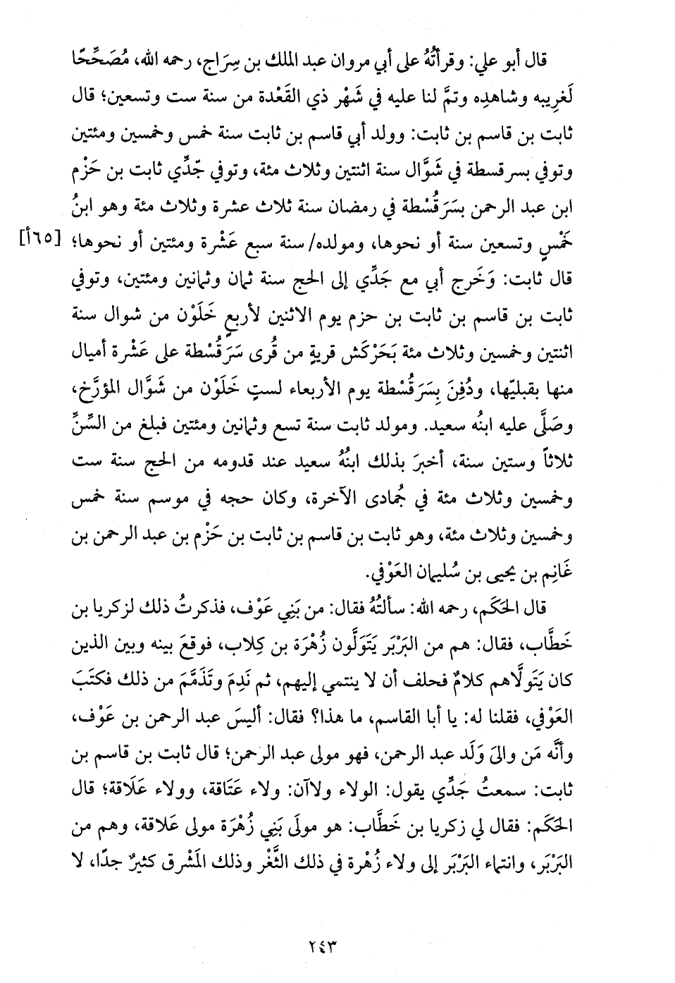 قال أبو علي: وقرأته على أبي مروان عبد الملك بن سراج، رحمه الله، مصحّحا لغريبه وشاهده وتمّ لنا عليه في شهر ذي القعدة من سنة ست وتسعين؛ قال ثابت بن قاسم بن ثابت: وولد أبي قاسم بن ثابت سنة خمس وخمسين ومئتين وتوفي بسرقسطة في شوّال سنة اثنتين وثلاث مئة، وتوفي جّدّي ثابت بن حزم ابن عبد الرحمن بسرقسطة في رمضان سنة ثلاث عشرة وثلاث مئة وهو ابن خمس وتسعين سنة أو نحوها، ومولده / سنة سبع عشرة ومئتين أو نحوها؛ قال ثابت: وخرج أبي مع جدّي إلى الحج سنة ثمان وثمانين ومئتين، وتوفي ثابت بن قاسم بن ثابت بن حزم يوم الاثنين لأربع خلون من شوال سنة اثنتين وخمسين وثلاث مئة بحركش قرية من قرى سرقسطة على عشرة أميال منها بقبليّها، ودفن بسرقسطة يوم الأربعاء لست خلون من شوّال المؤرّخ، وصلّى عليه ابنه سعيد. ومولد ثابت سنة تسع وثمانين ومئتين فبلغ من السّنّ ثلاثا وستين سنة، أخبر بذلك ابنه سعيد عند قدومه من الحج سنة ست وخمسين وثلاث مئة في جمادى الآخرة، وكان حجه في موسم سنة خمس وخمسين وثلاث مئة، وهو ثابت بن قاسم بن ثابت بن حزم بن عبد الرحمن بن غانم بن يحيى بن سليمان العوفي.