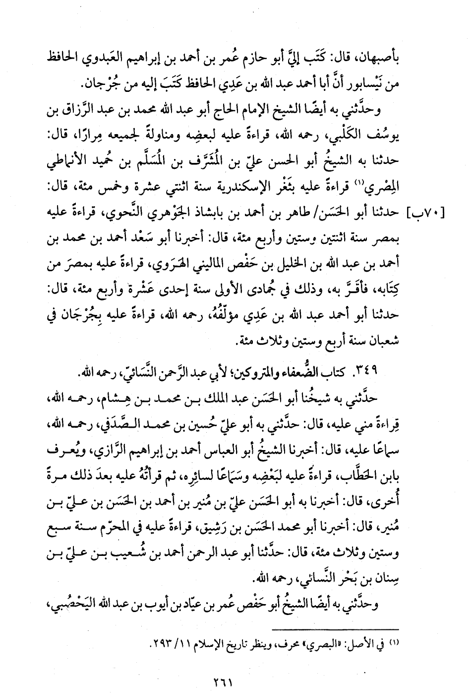 بأصبهان، قال: كتب إليّ أبو حازم عمر بن أحمد بن إبراهيم العبدوي الحافظ من نيسابور أنّ أبا أحمد عبد الله بن عدي الحافظ كتب إليه من جرجان.