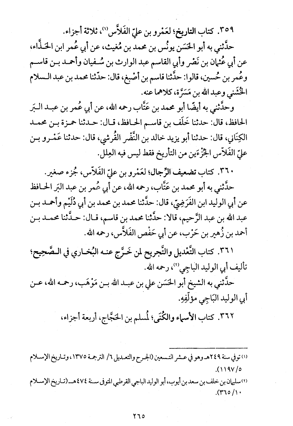 وحدّثني به أيضا أبو محمد بن عتّاب رحمه الله، عن أبي عمر بن عبد البر الحافظ، قال: حدثنا خلف بن قاسم الحافظ، قال: حدثنا حمزة بن محمد الكناني، قال: حدثنا أبو يزيد خالد بن النّضر القرشي، قال: حدثنا عمرو بن عليّ الفلاّس الجزءين من التأريخ فقط ليس فيه العلل.