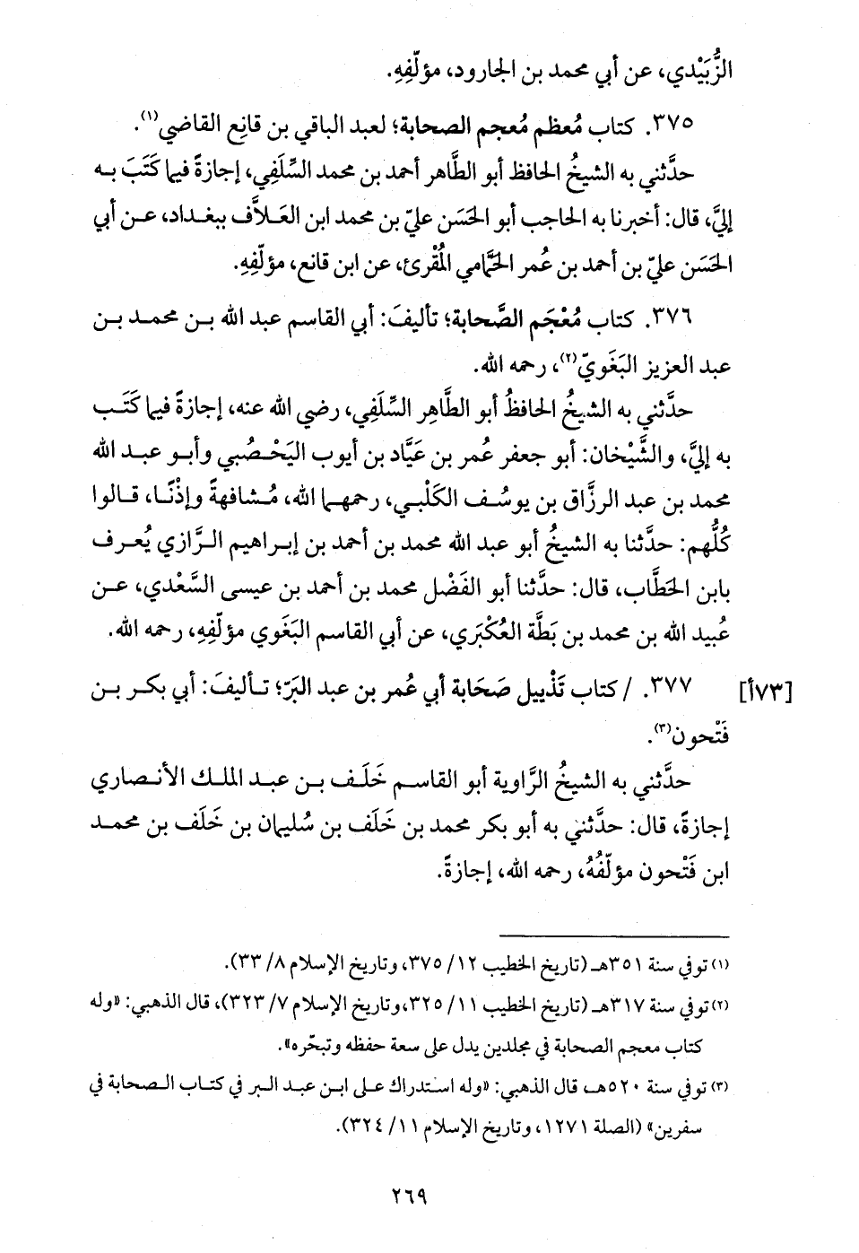 (¬2) توفي سنة 317 هـ (تاريخ الخطيب 11/ 325، وتاريخ الإسلام 7/ 323)، قال الذهبي: «وله كتاب معجم الصحابة في مجلدين يدل على سعة حفظه وتبحّره».