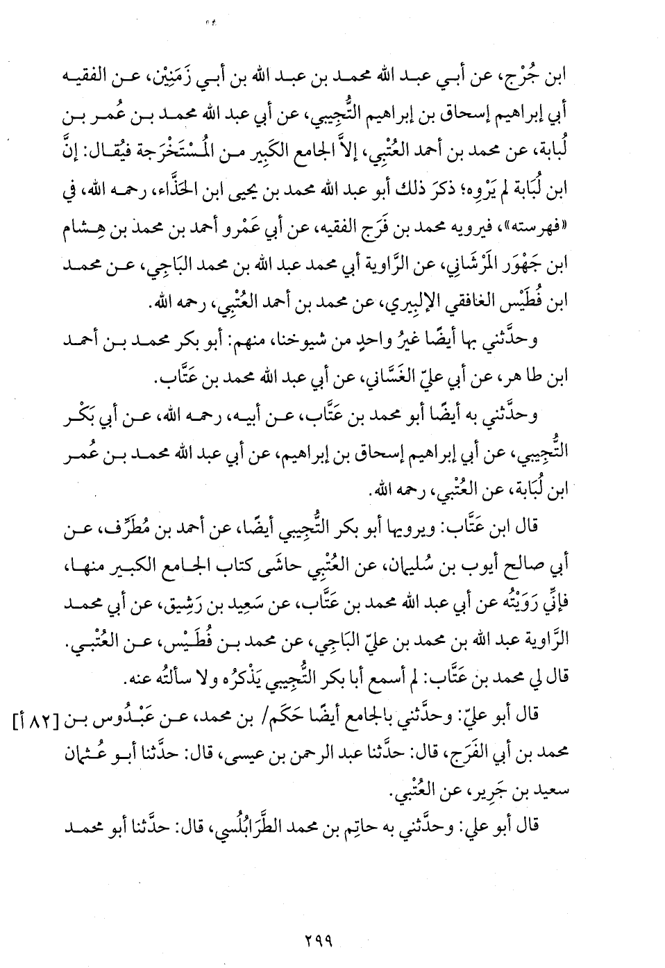 ابن جرج، عن أبي عبد الله محمد بن عبد الله بن أبي زمنين، عن الفقيه أبي إبراهيم إسحاق بن إبراهيم التّجيبي، عن أبي عبد الله محمد بن عمر بن لبابة، عن محمد بن أحمد العتبي، إلاّ الجامع الكبير من المستخرجة فيقال: إنّ ابن لبابة لم يروه؛ ذكر ذلك أبو عبد الله محمد بن يحيى ابن الحذّاء، رحمه الله، في «فهرسته»، فيرويه محمد بن فرج الفقيه، عن أبي عمرو أحمد بن محمد بن هشام ابن جهور المرشاني، عن الرّاوية أبي محمد عبد الله بن محمد الباجي، عن محمد ابن فطيس الغافقي الإلبيري، عن محمد بن أحمد العتبي، رحمه الله.
