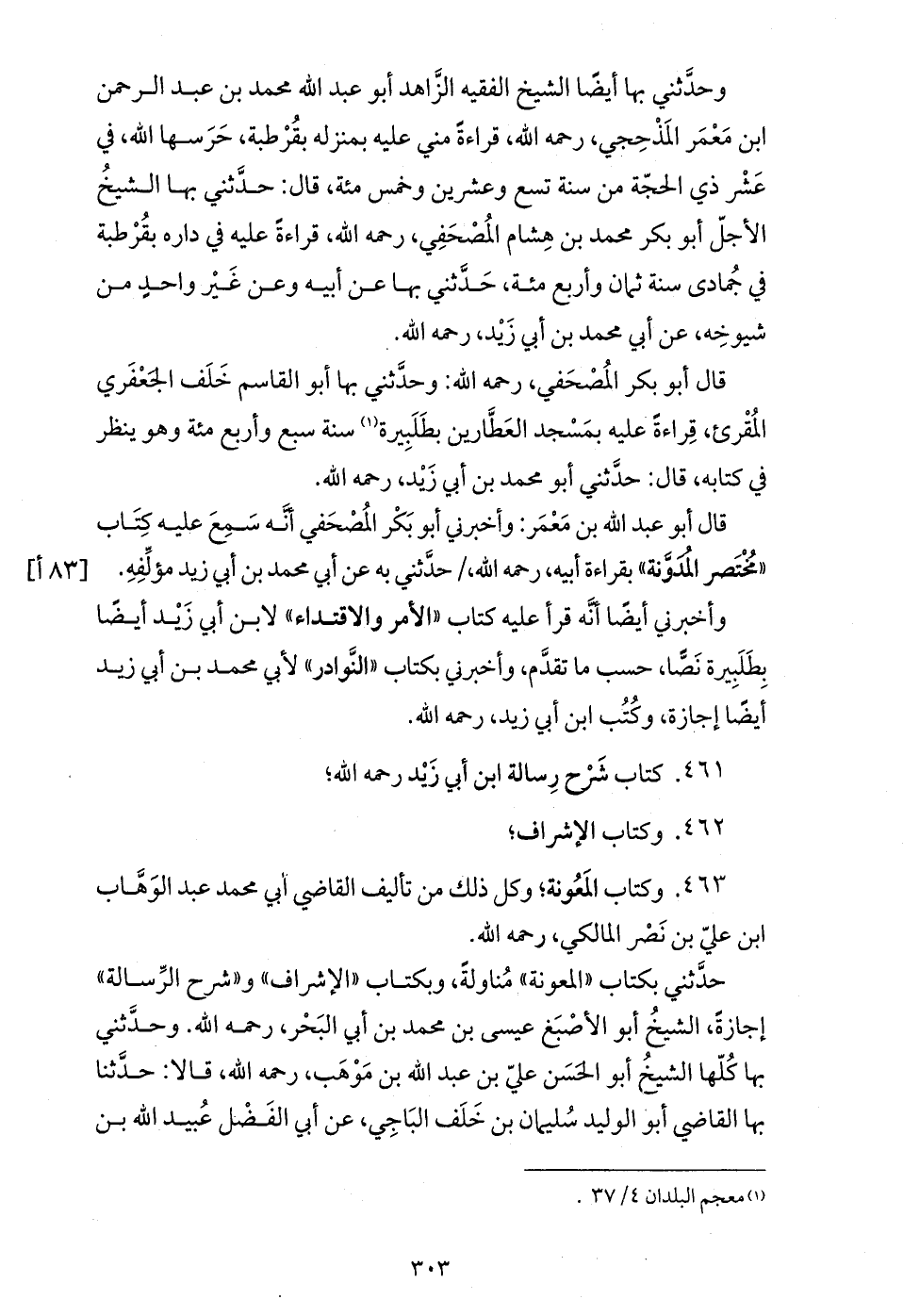 وحدّثني بها أيضا الشيخ الفقيه الزّاهد أبو عبد الله محمد بن عبد الرحمن ابن معمر المذحجي، رحمه الله، قراءة مني عليه بمنزله بقرطبة، حرسها الله، في عشر ذي الحجّة من سنة تسع وعشرين وخمس مئة، قال: حدّثني بها الشيخ الأجلّ أبو بكر محمد بن هشام المصحفي، رحمه الله، قراءة عليه في داره بقرطبة في جمادى سنة ثمان وأربع مئة، حدّثني بها عن أبيه وعن غير واحد من شيوخه، عن أبي محمد بن أبي زيد، رحمه الله.