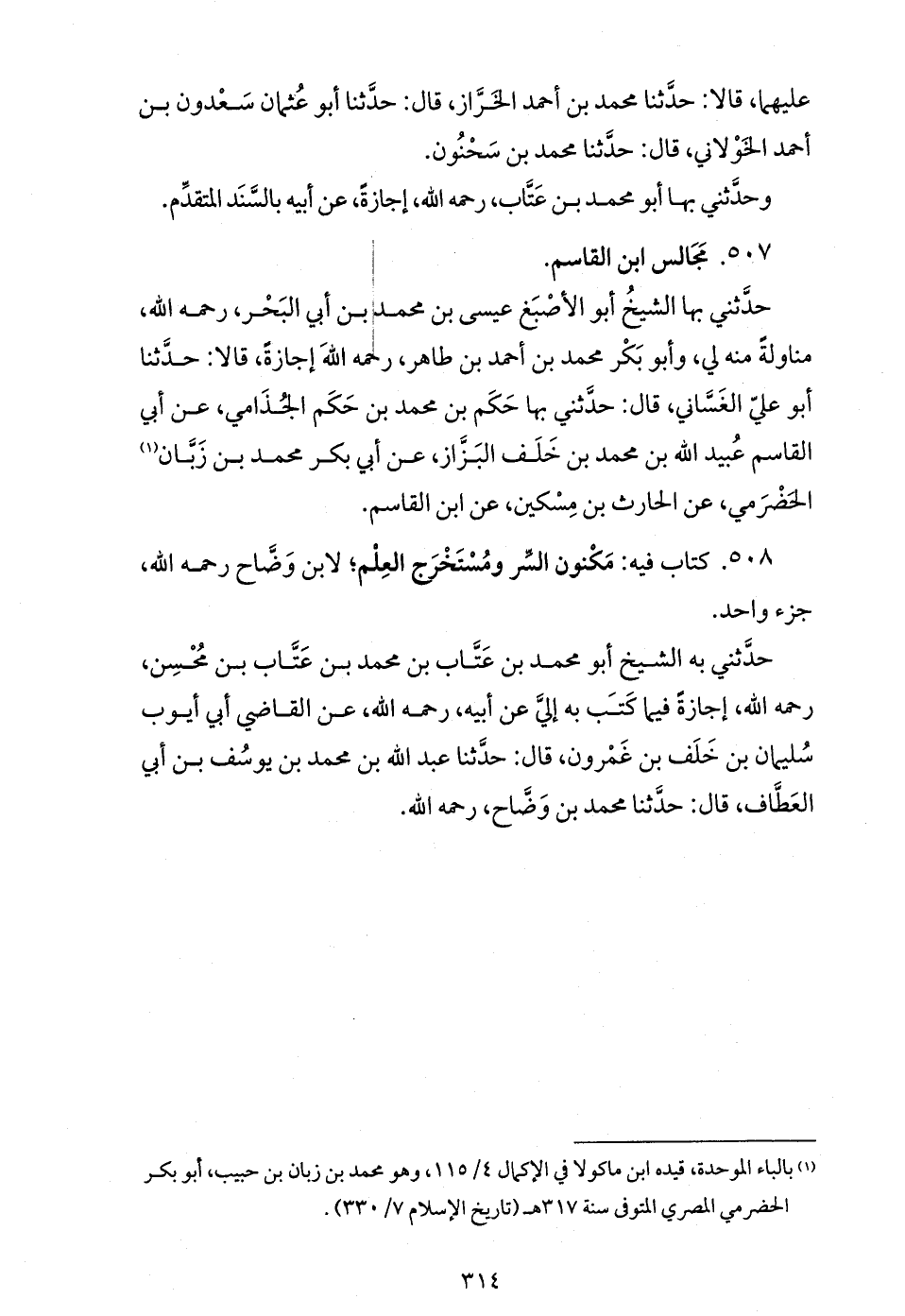 عليهما، قالا: حدّثنا محمد بن أحمد الخزّاز، قال: حدّثنا أبو عثمان سعدون بن أحمد الخولاني، قال: حدّثنا محمد بن سحنون.