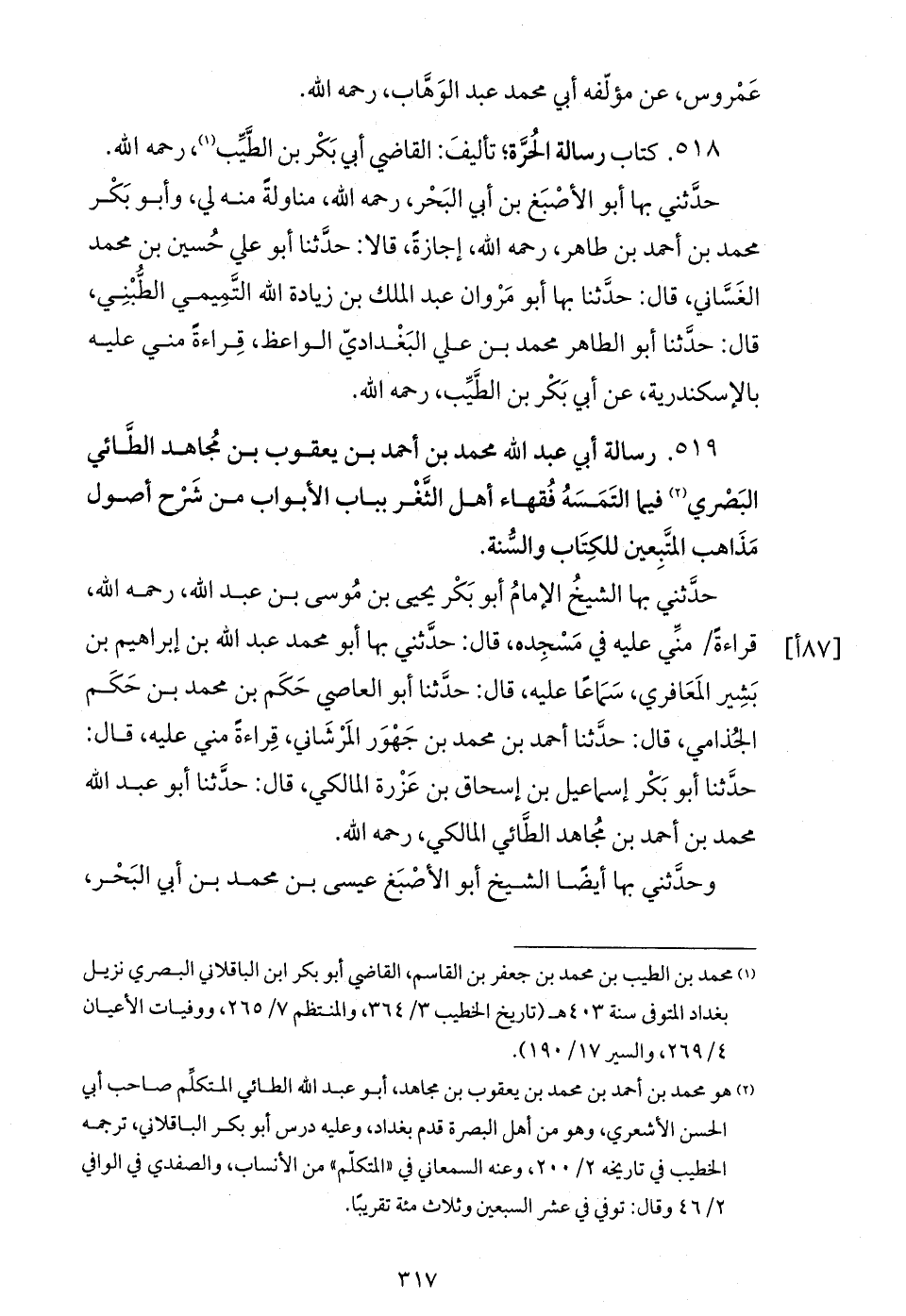 (¬2) هو محمد بن أحمد بن محمد بن يعقوب بن مجاهد، أبو عبد الله الطائي المتكلّم صاحب أبي الحسن الأشعري، وهو من أهل البصرة قدم بغداد، وعليه درس أبو بكر الباقلاني، ترجمه الخطيب في تاريخه 2/ 200، وعنه السمعاني في «المتكلّم» من الأنساب، والصفدي في الوافي 2/ 46، وقال: توفي في عشر السبعين وثلاث مئة تقريبا.