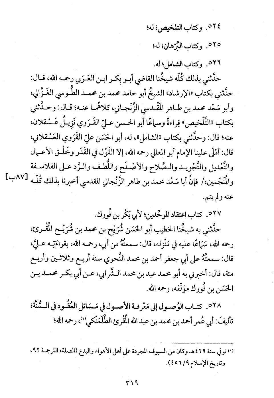 حدّثني بذلك كلّه شيخنا القاضي أبو بكر ابن العربي رحمه الله، قال: حدّثني بكتاب «الإرشاد» الشيخ أبو حامد محمد بن محمد الطّوسي الغزّالي، وأبو سعد محمد بن طاهر المقدسي الزّنجاني، كلاهما عنه؛ قال: وحدّثني بكتاب «التّلخيص» قراءة وسماعا أبو الحسن عليّ القروي نزيل عسقلان، عنه؛ قال: وحدّثني بكتاب «الشامل»، له، أبو الحسن عليّ القروي العسقلاني، قال: أملى علينا الإمام أبو المعالي رحمه الله، إلا القول في القدر وخلق الأعمال والتّعديل والتّجويد والصّلاح والأصلح واللّطف والرّد على الفلاسفة والمنجّمين، / فإنّ أبا سعد محمد بن طاهر الزّنجاني المقدسي أخبرنا بذلك كلّه عنه ولم يتم.