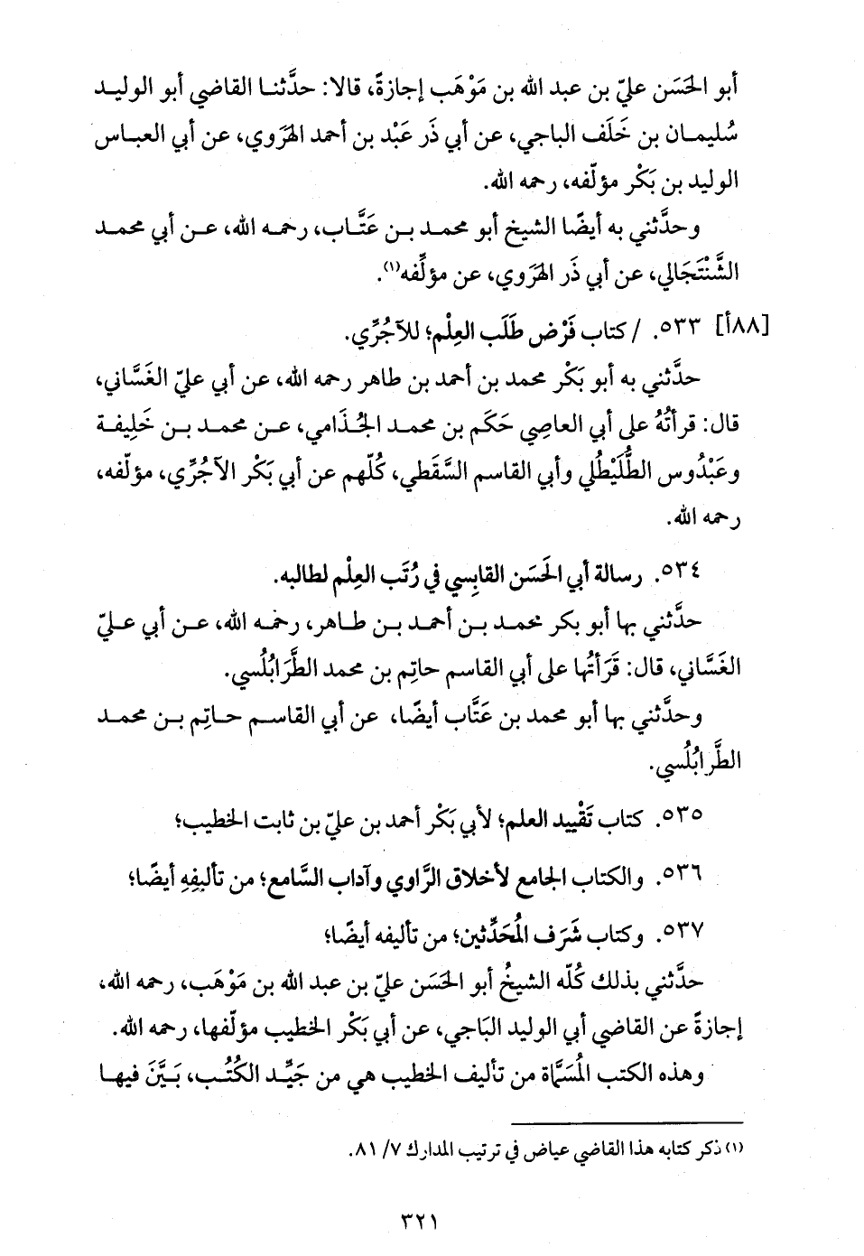 حدّثني بذلك كلّه الشيخ أبو الحسن عليّ بن عبد الله بن موهب، رحمه الله، إجازة عن القاضي أبي الوليد الباجي، عن أبي بكر الخطيب مؤلّفها، رحمه الله.