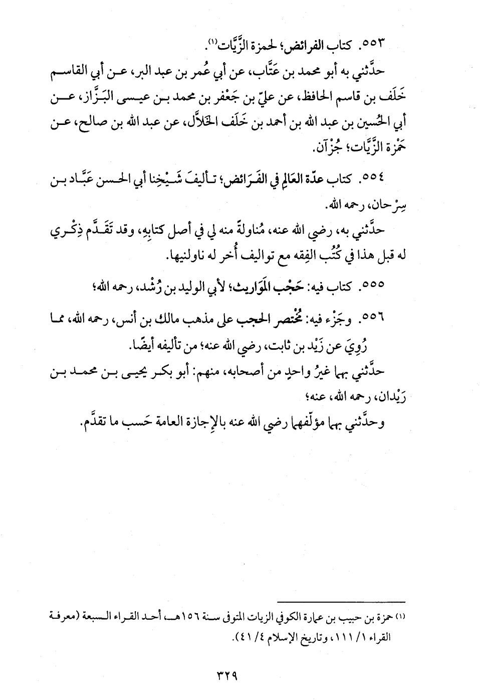 حدّثني به أبو محمد بن عتّاب، عن أبي عمر بن عبد البر، عن أبي القاسم خلف بن قاسم الحافظ، عن عليّ بن جعفر بن محمد بن عيسى البزّاز، عن أبي الحسين بن عبد الله بن أحمد بن خلف الخلاّل، عن عبد الله بن صالح، عن حمزة الزّيّات؛ جزآن.