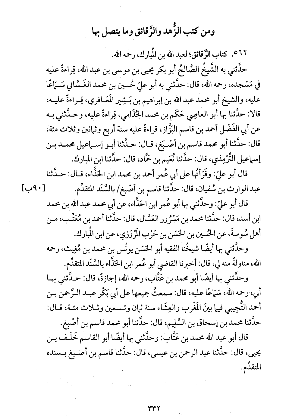قال أبو عليّ: وحدّثني بها أبو عمر ابن الحذّاء، عن أبي محمد عبد الله بن محمد ابن أسد، قال: حدّثنا محمد بن مسرور العسّال، قال: حدّثنا أحمد بن معتّب، من أهل سوسة، عن الحسين بن الحسن بن حرب المروزي، عن ابن المبارك.