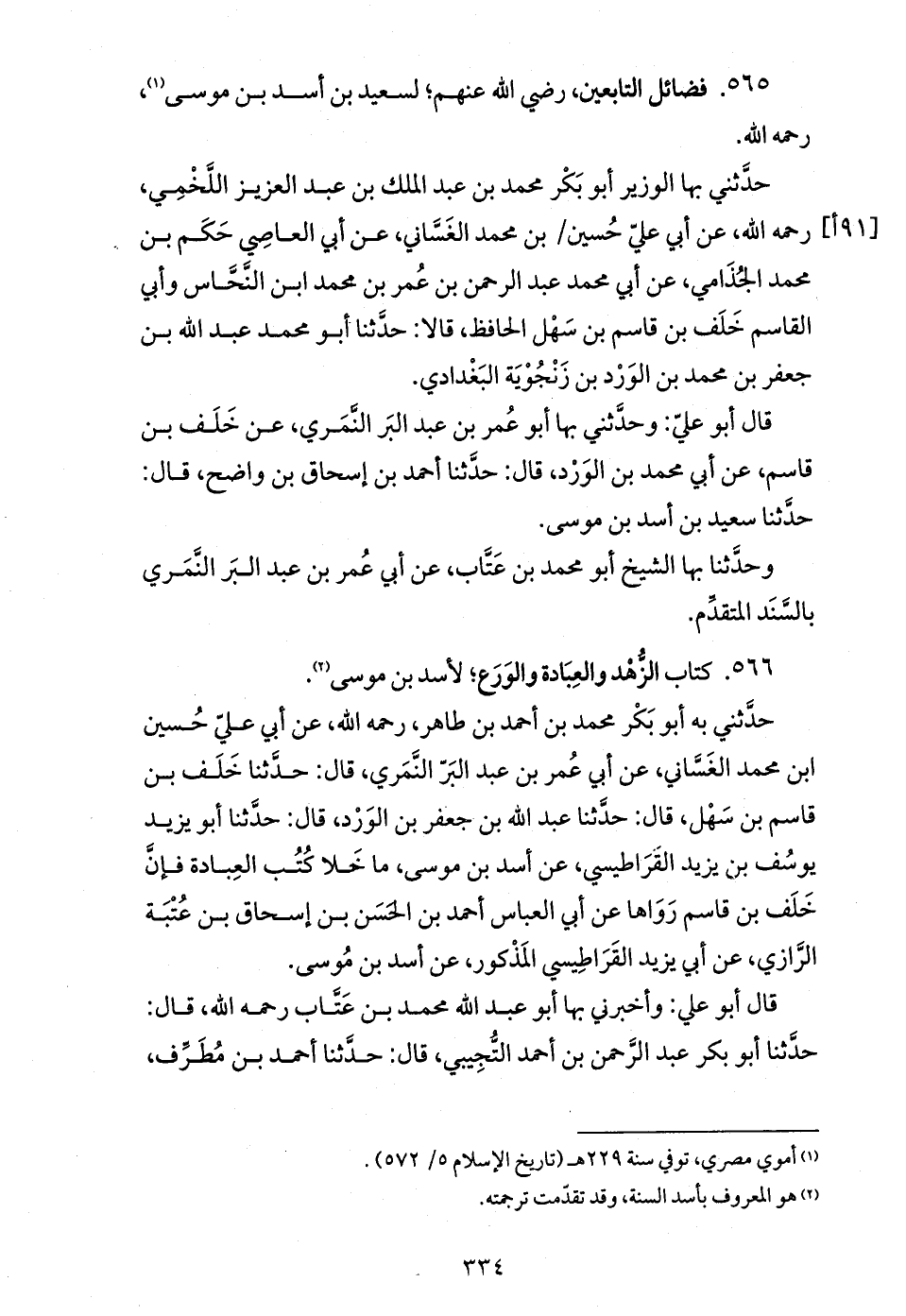 حدّثني به أبو بكر محمد بن أحمد بن طاهر، رحمه الله، عن أبي عليّ حسين ابن محمد الغسّاني، عن أبي عمر بن عبد البرّ النّمري، قال: حدّثنا خلف بن قاسم بن سهل، قال: حدّثنا عبد الله بن جعفر بن الورد، قال: حدّثنا أبو يزيد يوسف بن يزيد القراطيسي، عن أسد بن موسى، ما خلا كتب العبادة فإنّ خلف بن قاسم رواها عن أبي العباس أحمد بن الحسن بن إسحاق بن عتبة الرّازي، عن أبي يزيد القراطيسي المذكور، عن أسد بن موسى.