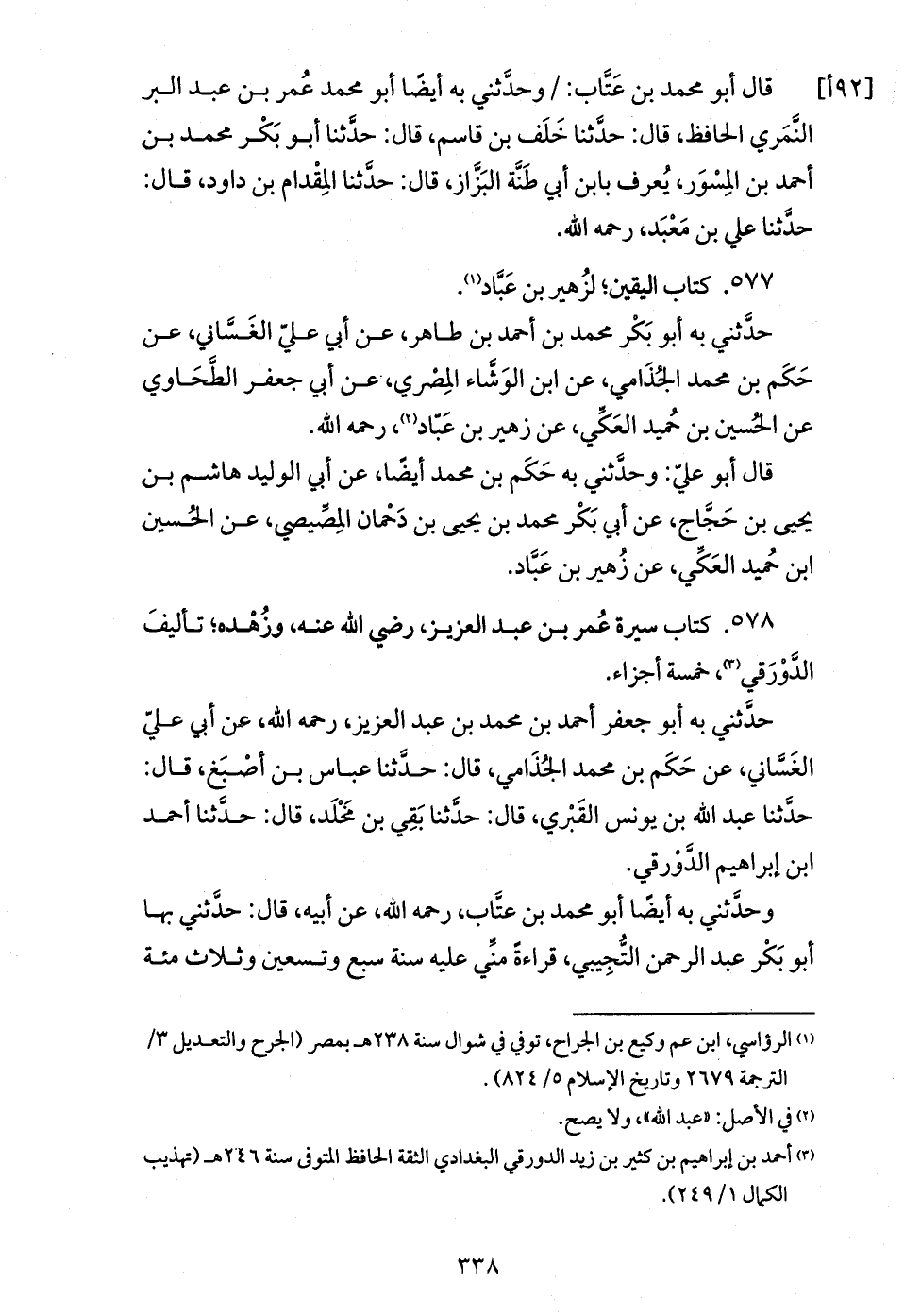 حدّثني به أبو جعفر أحمد بن محمد بن عبد العزيز، رحمه الله، عن أبي عليّ الغسّاني، عن حكم بن محمد الجذامي، قال: حدّثنا عباس بن أصبغ، قال: حدّثنا عبد الله بن يونس القبري، قال: حدّثنا بقي بن مخلد، قال: حدّثنا أحمد ابن إبراهيم الدّورقي.